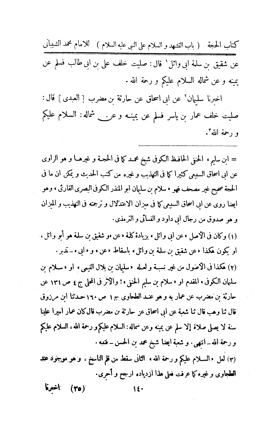اُخْبُرْنَا سُلَيْمَان عَن ابي اسحاق عَن حَارِثَة بن مضرب الْعَبْدي قَالَ صليت خلف عمار بن يَاسر فَسلم عَن يَمِينه وَعَن شِمَاله السَّلَام عَلَيْكُم وَرَحْمَة الله