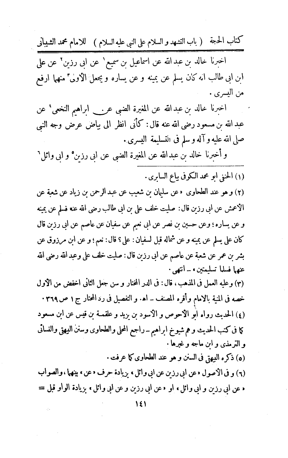 اُخْبُرْنَا خَالِد بن عبد الله عَن الْمُغيرَة الضَّبِّيّ عَن ابراهيم النَّخعِيّ عَن عبد الله بن مَسْعُود رَضِي الله عَنهُ قَالَ كَأَنِّي انْظُر إِلَى بَيَاض عرض وَجه النَّبِي صلى الله عَلَيْهِ وَسلم فِي التسليمة الْيُسْرَى