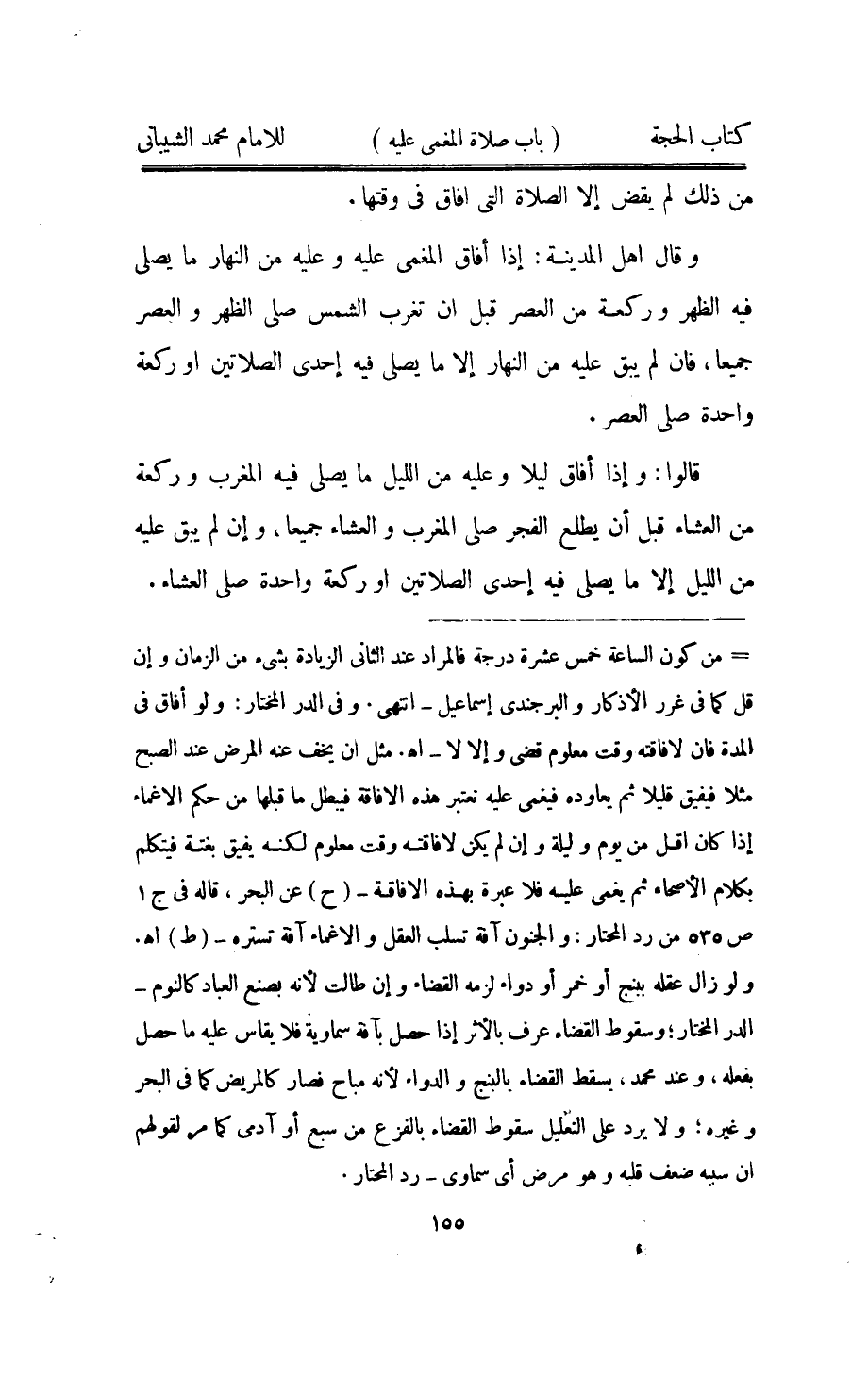 وَقَالَ اهل الْمَدِينَة إِذا أَفَاق الْمغمى عَلَيْهِ وَعَلِيهِ من النَّهَار مَا يُصَلِّي فِيهِ الظّهْر وركعة من الْعَصْر قبل ان تغرب الشَّمْس صلى الظّهْر وَالْعصر جَمِيعًا فان لم يبْق عَلَيْهِ من النَّهَار الا مَا يُصَلِّي فِيهِ إِحْدَى الصَّلَاتَيْنِ اَوْ رَكْعَة وَاحِد صلى الْعَصْر