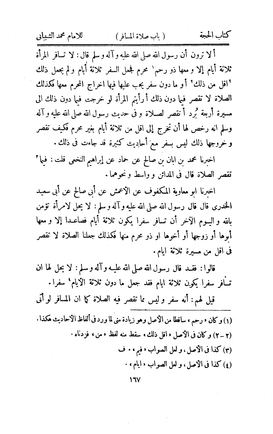 الا ترَوْنَ ان رَسُول الله صلى الله عَلَيْهِ واله وَسلم قَالَ لَا تُسَافِر المراة ثَلَاثَة ايام الا وَمَعَهَا ذُو رحم محرم فَجعل السّفر ثَلَاثَة ايام وَلم يَجْعَل ذَلِك اقل من ذَلِك اَوْ مَا دون سفر يجب عَلَيْهَا فِيهَا اخراج الْمحرم مَعهَا فَكَذَلِك الصَّلَاة لَا تقصر فِيمَا دون ذَلِك ارايتم المراة لَو خرجت فِيمَا دون ذَلِك الى مسيرَة اربعة برد اتقصر لصَلَاة وَفِي حَدِيث رَسُول الله صلى الله عَلَيْهِ واله وَسلم انه رخص لَهَا ان تخرج الى اقل من ثَلَاثَة ايام بِغَيْر محرم فَكيف تقصر وخروجها ذَلِك لَيْسَ بسفر مَعَ احاديث كَثِيرَة قد جَاءَت فِي ذَلِك