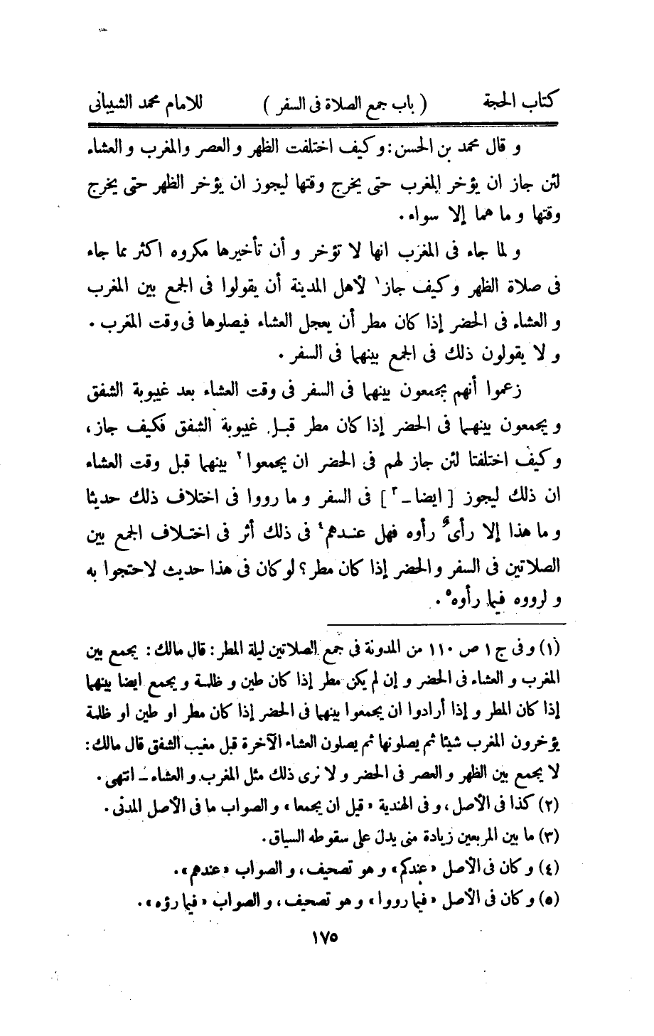 زَعَمُوا انهم يجمعُونَ بَينهمَا فِي السّفر فِي وَقت الْعشَاء بعد غيبوبة الشَّفق ويجمعون بَينهمَا فِي الْحَضَر اذا كَانَ مطر قبل غيبوبة الشَّفق فَكيف جَازَ وَكَيف اختلفتا لَئِن جَازَ لَهُم فِي الْحَضَر ان يجمعوا بَينهمَا قبل وَقت الْعشَاء ان ذَلِك ليجوز (ايضا) فِي السّفر وَمَا روو فِي اخْتِلَاف ذَلِك حَدِيثا وَمَا هَذَا الا راي راوه عِنْدهم فِي ذَلِك اثر فِي اخْتِلَاف الْجمع بَين الصَّلَاتَيْنِ فِي السّفر والحضر اذا كَانَ مطر لَو كَانَ فِي هَذَا حَدِيث لاحتجوا بِهِ ولرووه فِيمَا راوه