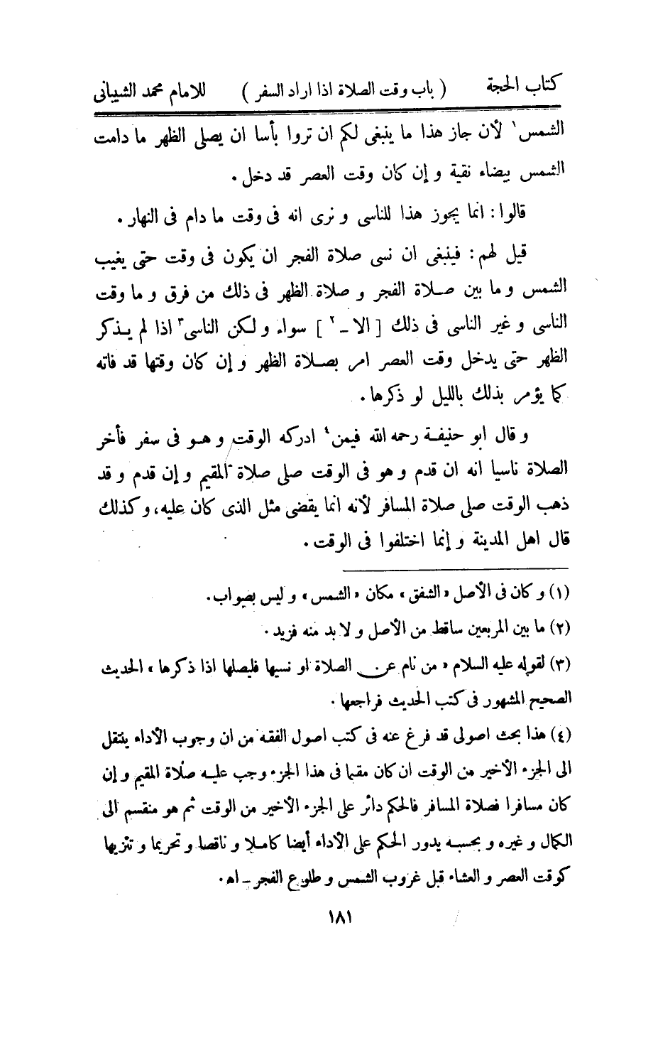 قيل لَهُم فَيَنْبَغِي ان نسى صَلَاة الْفجْر ان يكون فِي وَقت حَتَّى يغيب الشَّمْس وَمَا بَين صَلَاة الْفجْر وَصَلَاة الظّهْر فِي ذَلِك من فرق وَمَا وَقت النَّاسِي وَغير النَّاسِي فِي ذَلِك الا سَوَاء وَلَكِن النَّاسِي اذا لم يذكر الظّهْر حَتَّى يدْخل وَقت الْعَصْر امْر بِصَلَاة الظّهْر وان كَانَ وَقتهَا قد فَاتَهُ كَمَا يُؤمر بذلك بِاللَّيْلِ لَو ذكرهَا وَقَالَ ابو حنيفَة رَحمَه الله فِيمَن ادركه الْوَقْت وَهُوَ فِي سفر فاخر الصَّلَاة نَاسِيا انه قدم وَهُوَ فِي الْوَقْت صلى صَلَاة الْمُقِيم وان قدم وَقد ذهب الْوَقْت صلى صَلَاة الْمُسَافِر لانه انما يقْضِي مثل الَّذِي كَانَ عَلَيْهِ وَكَذَلِكَ قَالَ اهل الْمَدِينَة وانما اخْتلفُوا فِي الْوَقْت