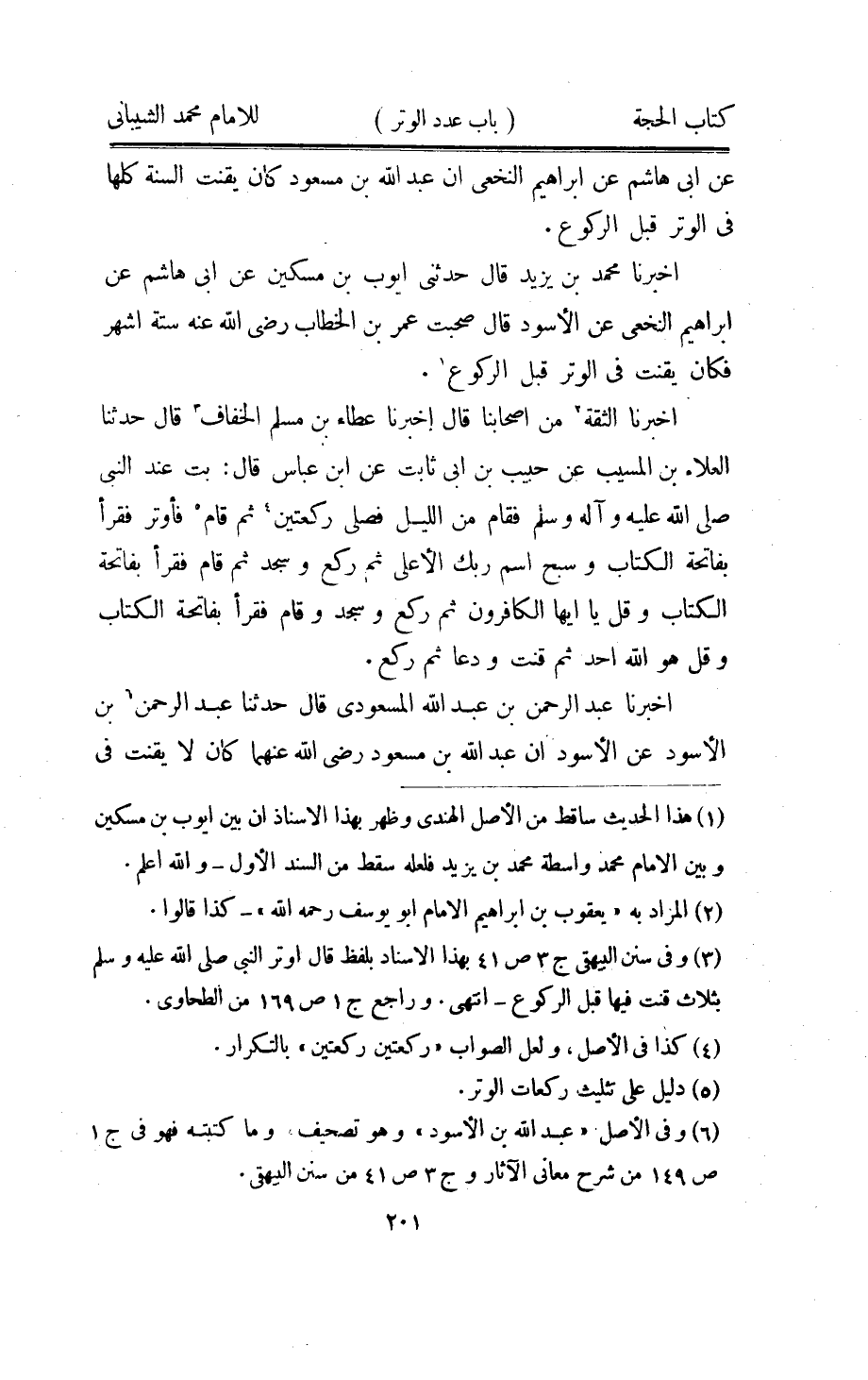 اُخْبُرْنَا عبد الرَّحْمَن بن عبد الله المسعودى قَالَ حَدثنَا عبد الرَّحْمَن بن الاسود عَن الاسود ان عبد الله بن مَسْعُود رَضِي الله عَنْهُمَا كَانَ لَا يقنت فِي
