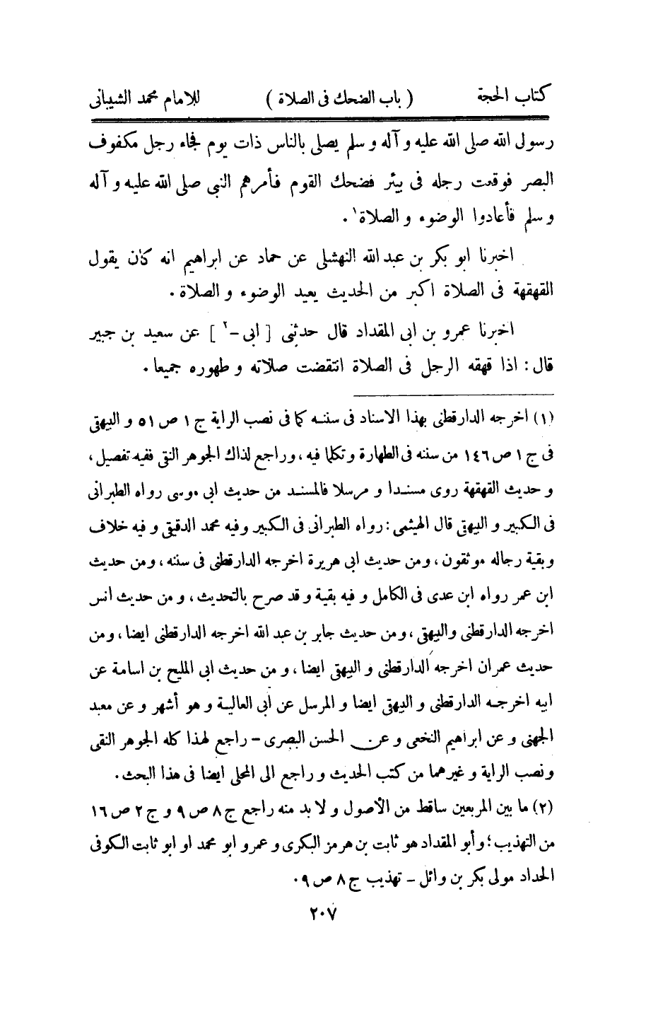 اُخْبُرْنَا ابو بكر بن عبد الله النَّهْشَلِي عَن حَمَّاد عَن ابراهيم انه كَانَ يقو القهقهة فِي الصَّلَاة اكبر من الحَدِيث يُعِيد الْوضُوء وَالصَّلَاة