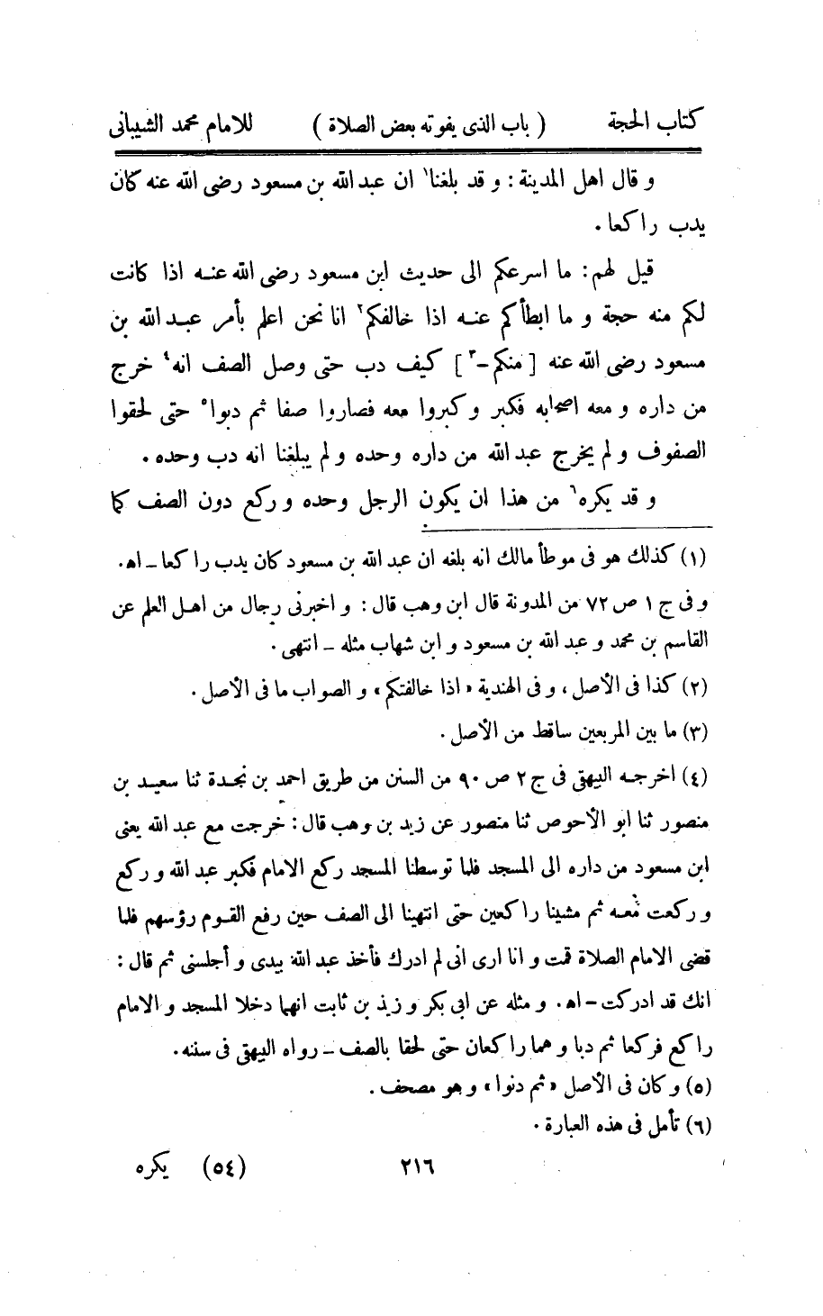 قيل لَهُم مَا اسرعكم الى حَدِيث ابْن مَسْعُود رَضِي الله عَنهُ اذا كَانَت لكم مِنْهُ حجَّة وَمَا ابطاكم عَنهُ اذا خالفكم انا نَحن اعْلَم بامر عبد الله بن مَسْعُود رَضِي الله عَنهُ (مِنْكُم) كَيفَ دب حَتَّى وصل الصَّفّ انه خرج من دَاره اصحابه فَكبر وَكَبرُوا مَعَه فصاروا صفا ثمَّ دبوا حَتَّى لَحِقُوا الصُّفُوف وَلم يخرج عبد الله من دَاره وَحده وَلم يبلغنَا انه دب وَحده