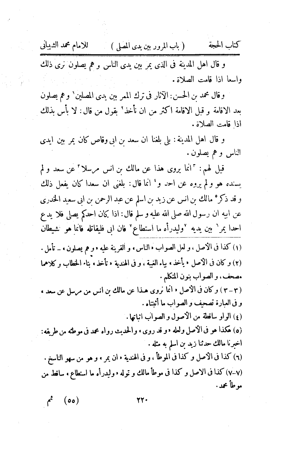 وَقَالَ مُحَمَّد بن الْحسن الاثار فِي ترك الْمَمَر بَين يَدي الْمُصَلِّين وهم يصلونَ بعد الاقامة وَقبل الاقامة اكثر من ان نَأْخُذ بقول من قَالَ لَا بَأْس بذلك اذا قَامَت الصَّلَاة