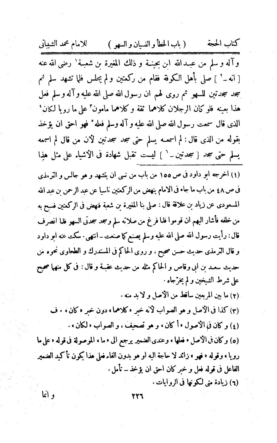 من عبد الله ابْن بُحَيْنَة وَذَلِكَ الْمُغيرَة بن شُعْبَة رَضِي الله عَنهُ انه صلى بَاهل الْكُوفَة فَقَامَ من رَكْعَتَيْنِ وَلم يجلس فَلَمَّا تشهد سلم ثمَّ سجد سَجْدَتَيْنِ للسَّهْو ثمَّ روى لَهُم ان رَسُول الله صلى الله عَلَيْهِ واله وَسلم فعل هَذَا بِعَيْنِه فَلَو كَانَ الرّجلَانِ كِلَاهُمَا ثِقَة وَكِلَاهُمَا مامون على مَا رويا لَكَانَ الَّذِي قَالَ سَمِعت رَسُول الله صلى الله عَلَيْهِ واله وَسلم فعله فَهُوَ احق ان يُؤْخَذ بقوله من الَّذِي قَالَ لم اسْمَعْهُ يسلم حَتَّى سجد سَجْدَتَيْنِ لَان من قَالَ لم اسْمَعْهُ يسلم حَتَّى سجد (سَجْدَتَيْنِ) لَيست تقبل شَهَادَة فِي الاشياء على مثل هَذَا