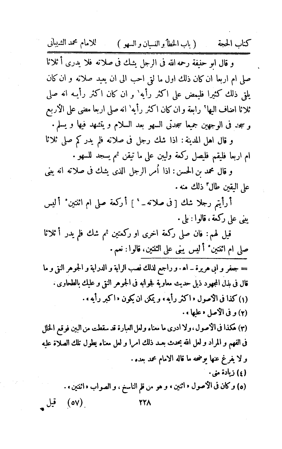 وَقَالَ ابو حنيفَة رَحمَه الله فِي الرجل يشك فِي صلَاته فَلَا يدْرِي اثلاثا صلى ام اربعا ان كَانَ ذَلِك اول مَا لَقِي احب الى ان يُعِيد صلَاته وَإِن كَانَ يلقِي ذَلِك كثيرا فليمض على اكثر رايه وان كَانَ اكثر رايه انه صلي ثَلَاثًا اضاف اليها رَابِعَة وان كَانَ اكثر رايه انه صلى ربعا مضى الاربع وَسجد فِي الْوَجْهَيْنِ جَمِيعًا سَجْدَتي السَّهْو بعد السَّلَام ويتشهد فِيهَا وَيسلم