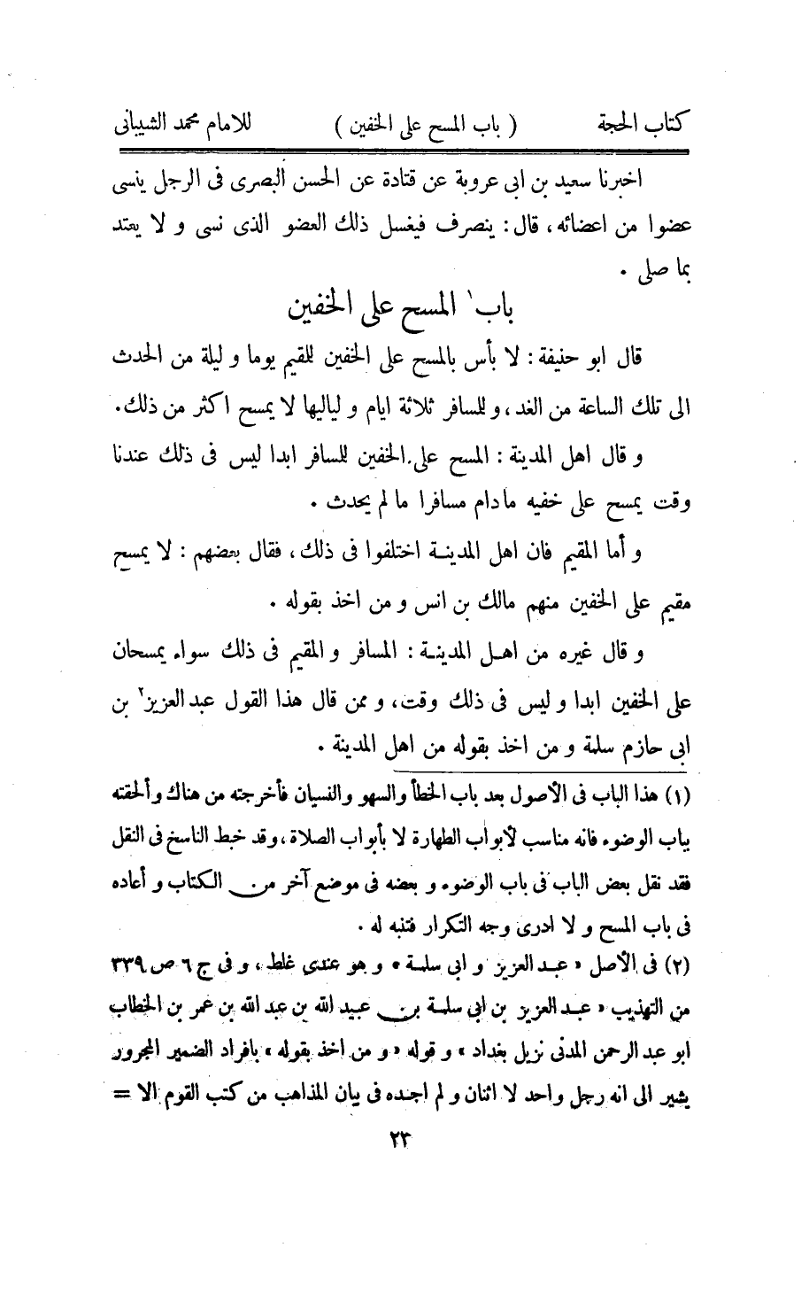 قَالَ ابو حنيفَة لَا بَأْس بِالْمَسْحِ على الْخُفَّيْنِ للمقيم يَوْمًا وَلَيْلَة من الْحَدث الى تِلْكَ السَّاعَة من الْغَد وللمسافر ثَلَاثَة ايام ولياليها لَا يمسح اكثر من ذَلِك وَقَالَ اهل الْمَدِينَة الْمسْح على الْخُفَّيْنِ للْمُسَافِر ابدا لَيْسَ فِي ذَلِك عندنَا وَقت يمسح على خفيه مَا دَامَ مُسَافِرًا مَا لم يحدث