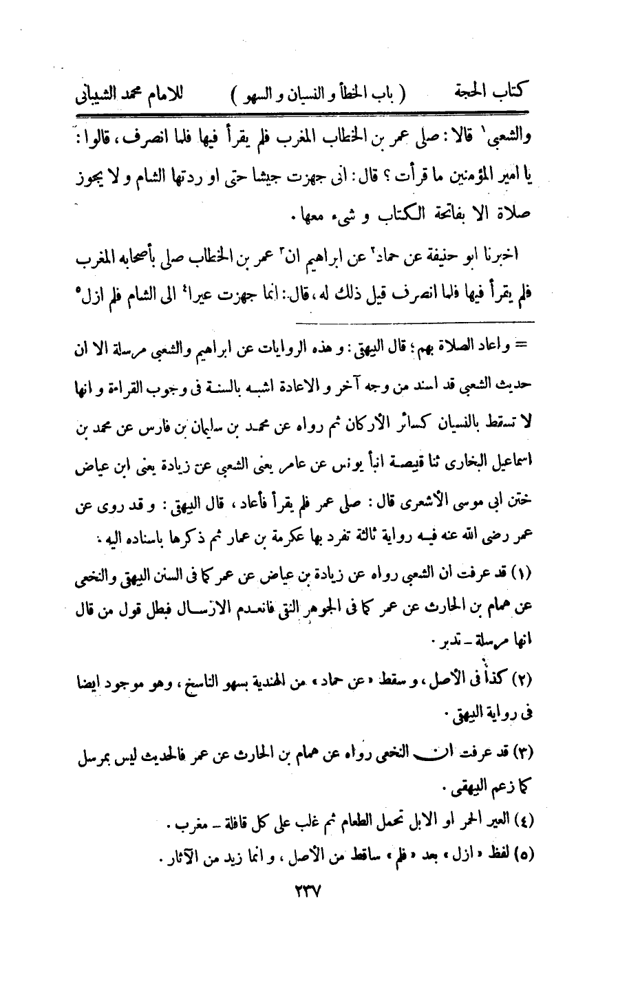 اُخْبُرْنَا ابو حنيفَة عَن حَمَّاد عَن ابراهيم ان عمر بن الْخطاب صلى بِأَصْحَابِهِ الْمغرب فَلم يقْرَأ فِيهَا فَلَمَّا انْصَرف قيل ذَلِك لَهُ قَالَ انما جهزت عيرًا الى الشَّام فَلم ازل