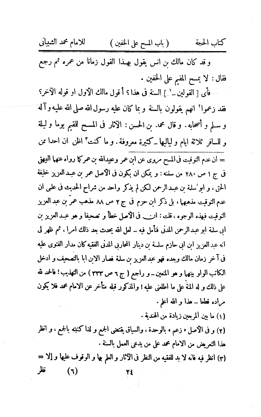 فَأَي (الْقَوْلَيْنِ) السّنة فِي هَذَا أَقُول مَالك الأول اَوْ قَوْله الآخر فقد زَعَمُوا انهم يَقُولُونَ بِالسنةِ وَبِمَا كَانَ عَلَيْهِ رَسُول الله صلى الله عَلَيْهِ وَسلم واصحابه وَقَالَ مُحَمَّد بن الْحسن الْآثَار فِي الْمسْح للمقيم يَوْمًا وَلَيْلَة وللمسافر ثَلَاثَة ايام ولياليها كَثِيرَة مَعْرُوفَة وَمَا كَانَت اظن ان اُحْدُ مِمَّن