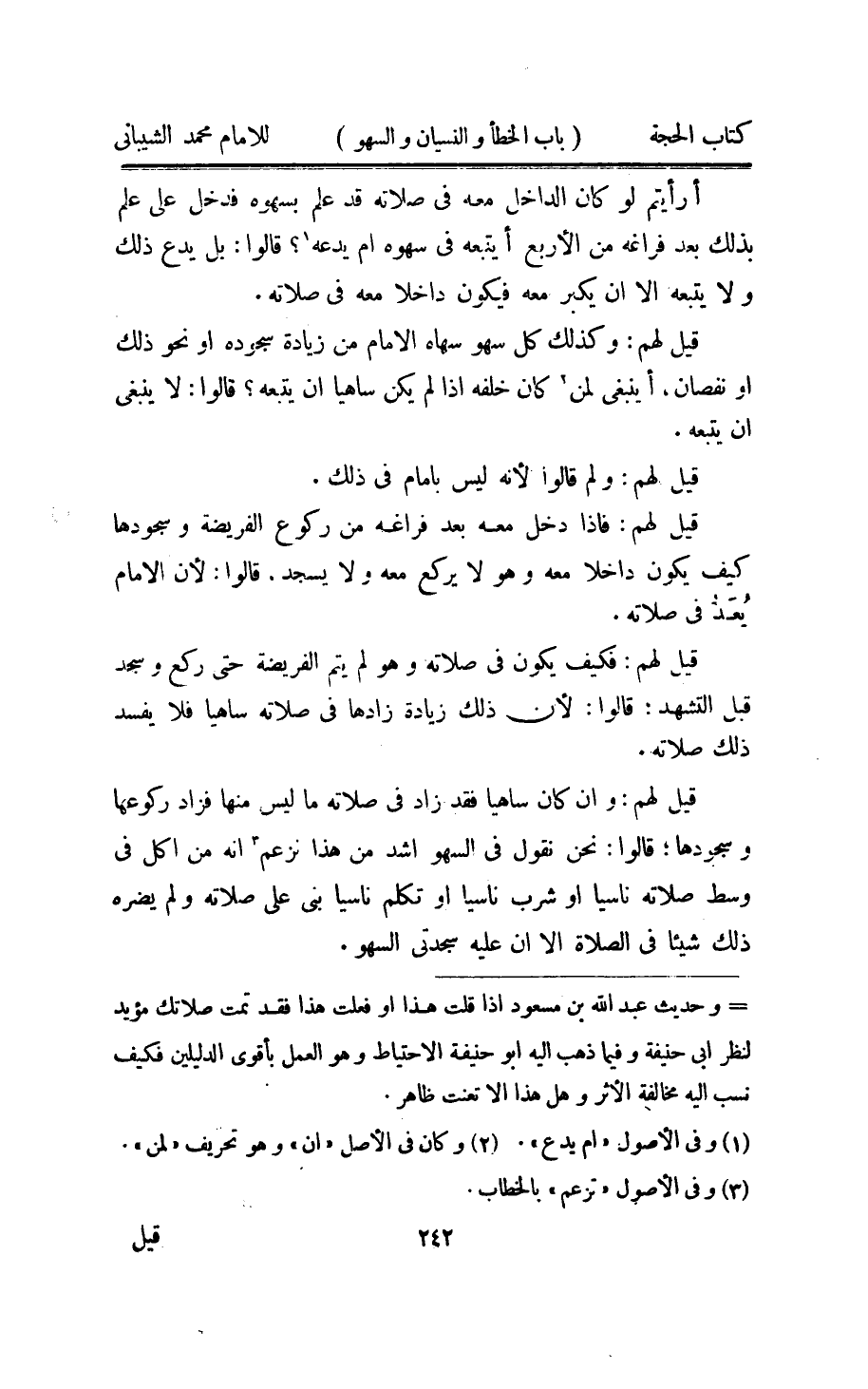 قيل لَهُم وَكَذَلِكَ كل سَهْو سهاه الامام من زِيَادَة سُجُوده اَوْ نَحْو ذَلِك اَوْ نُقْصَان اينبغي لمن كَانَ خَلفه اذا لم يكن سَاهِيا ان يتبعهُ قَالُوا لَا يَنْبَغِي ان يتبعهُ