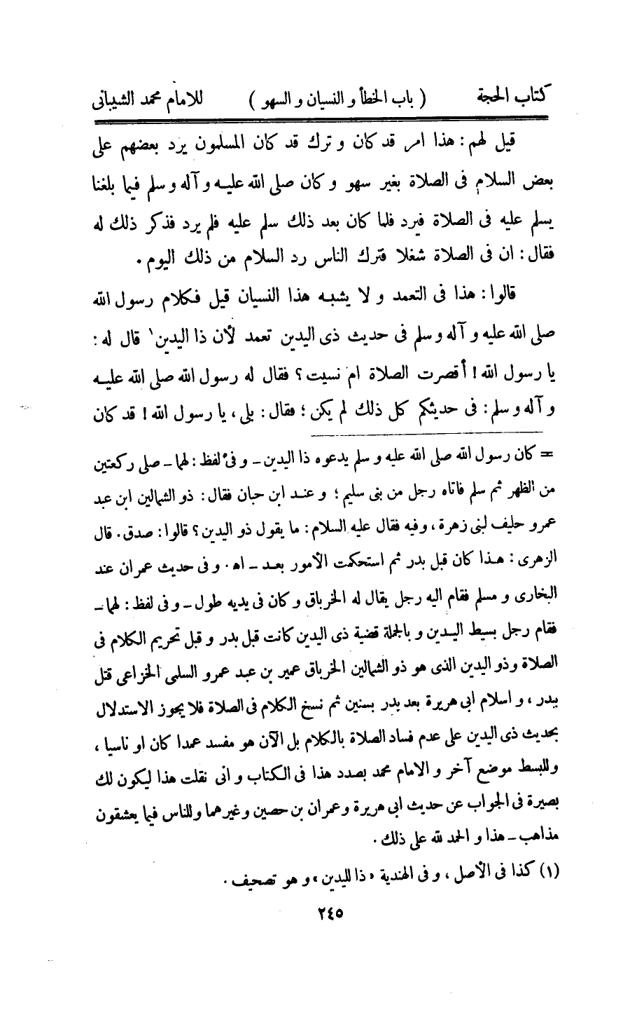 قَالُوا هَذَا فِي التعمد وَلَا يشبه هَذَا النسْيَان قيل فَكَلَام رَسُول الله صلى الله عَلَيْهِ واله وَسلم فِي حَدِيث ذِي الْيَدَيْنِ تعمد لَان ذَا الْيَدَيْنِ قَالَ لَهُ يَا رَسُول الله اقصرت الصَّلَاة ام نسيت فَقَالَ لَهُ رَسُول الله صلى الله عَلَيْهِ واله وَسلم فِي حديثكم كل ذَلِك لم يكن فَقَالَ بلَى يَا رَسُول الله قد كَانَ