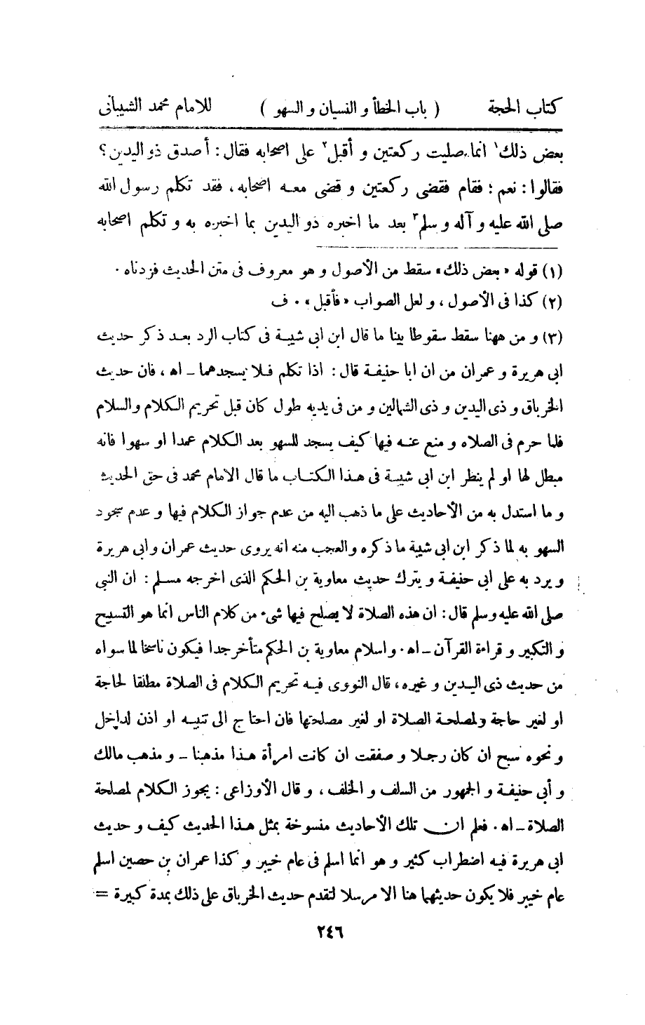 بعض ذَلِك انما صليت رَكْعَتَيْنِ وَاقْبَلْ على اصحابه فَقَالَ اصدق ذُو الْيَدَيْنِ فَقَالُوا نعم فَقَامَ فَقضى رَكْعَتَيْنِ وَقضى مَعَه اصحابه فقد تكلم رَسُول الله صلى الله عَليّ واله وَسلم بعد مَا اخبره ذُو الْيَدَيْنِ بِمَا اخبره بِهِ وَتكلم اصحابه