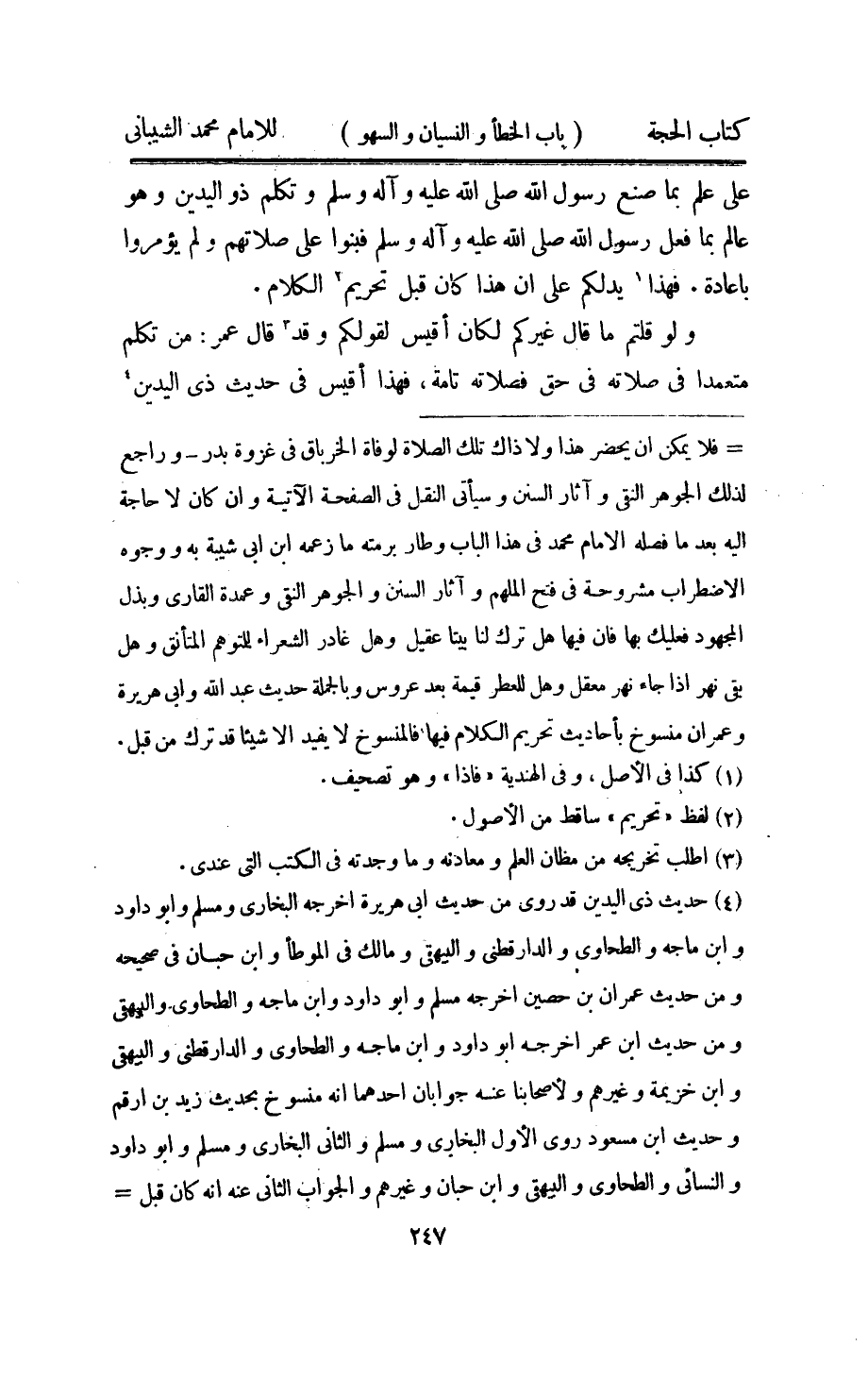 على علم بِمَا صنع رَسُول الله عَلَيْهِ واله وَسلم وَتكلم ذُو الْيَدَيْنِ وَهُوَ عَالم بِمَا فعل رَسُول الله صلى الله عَلَيْهِ واله وَسلم فبنوا على صلَاتهم وَلم يؤمروا باعادة فَهَذَا يدلكم على ان هَذَا كَانَ قبل تَحْرِيم الْكَلَام
