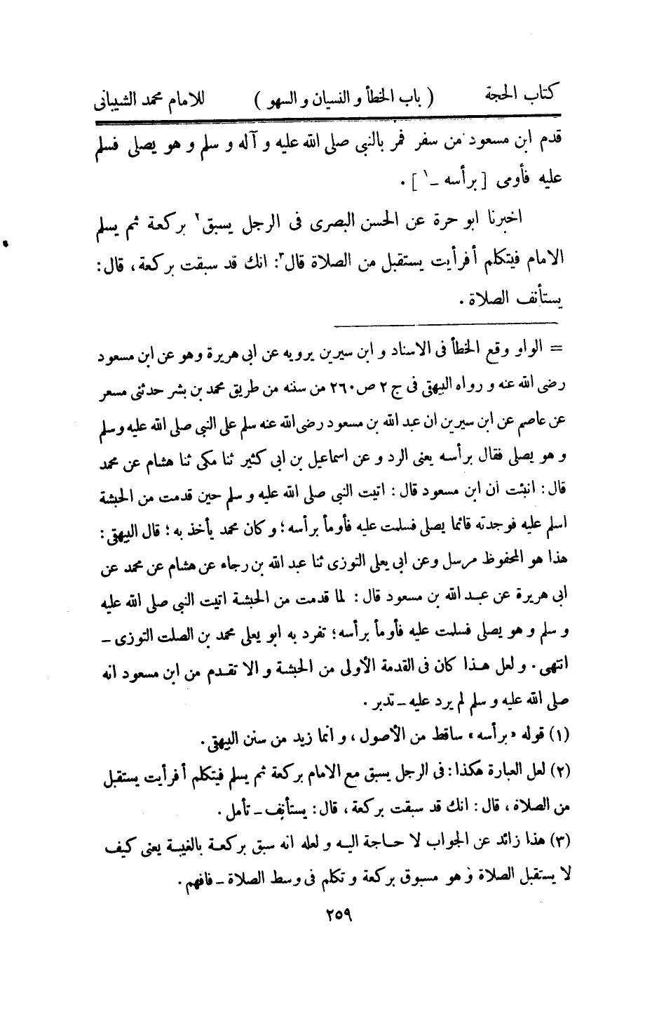 قدم ابْن مَسْعُود من سفر فَمر بِالنَّبِيِّ صلى الله عَلَيْهِ واله وَسلم وَهُوَ يُصَلِّي فَسلم عَلَيْهِ فاومى (براسه)