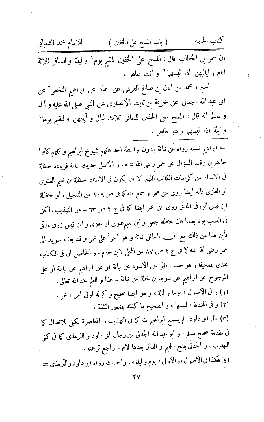 اُخْبُرْنَا مُحَمَّد بن ابان بن صَالح الْقرشِي عَن حَمَّاد عَن ابراهيم النَّخعِيّ عَن ابي عبد الله الجدلي عَن خُزَيْمَة بن ثَابت الانصاري عَن النَّبِي صلى الله عَلَيْهِ وَسلم انه قَالَ الْمسْح على الْخُفَّيْنِ للْمُسَافِر ثَلَاث لَيَال وايامهن وللمقيم يَوْمًا وَلَيْلَة اذا لبسهما وَهُوَ طَاهِر