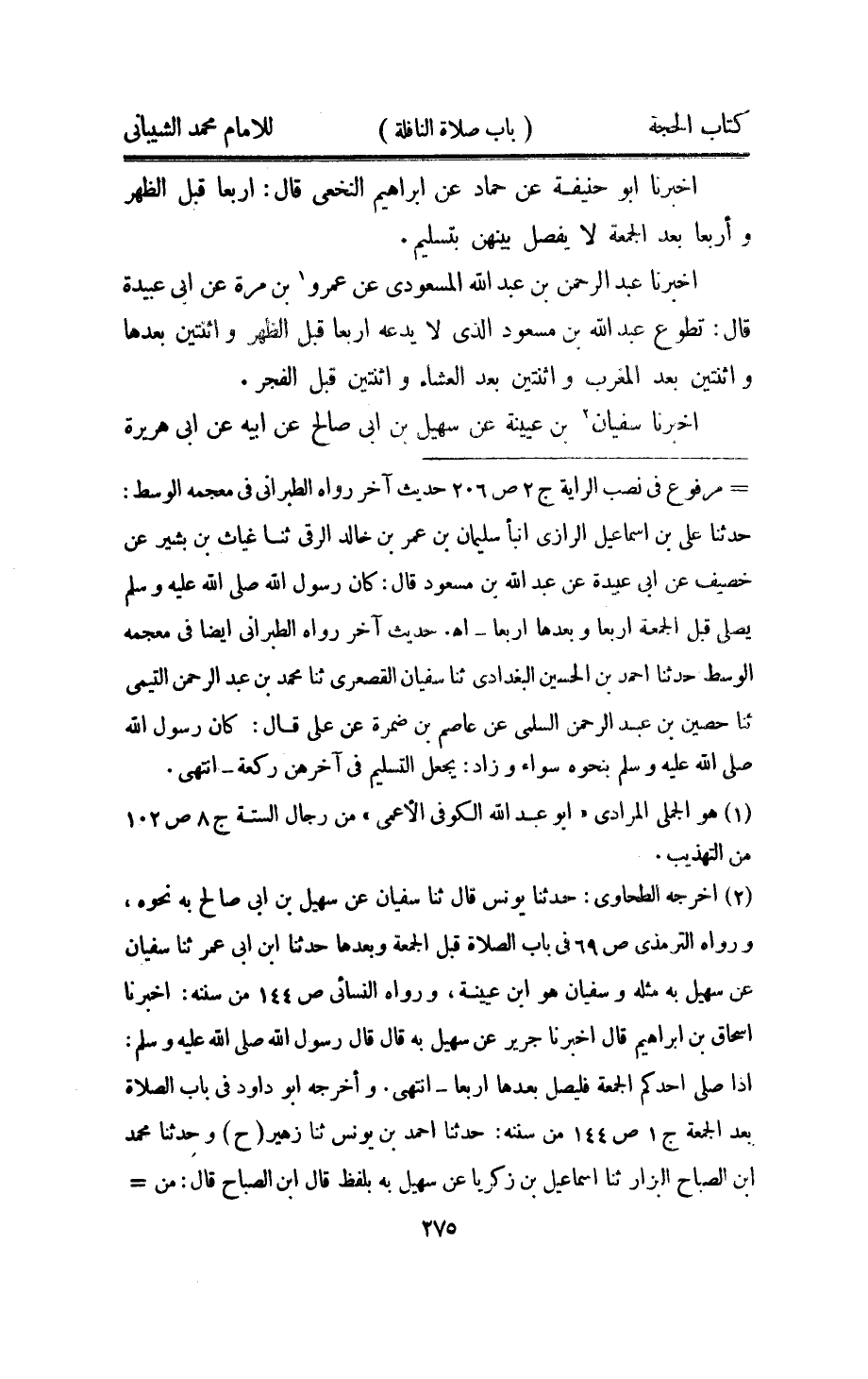 اُخْبُرْنَا ابو حنيفَة عَن حَمَّاد عَن ابراهيم النَّخعِيّ قَالَ اربعا قبل الظّهْر واربعا بعد الْجُمُعَة لَا يفصل بَينهُنَّ بِتَسْلِيم