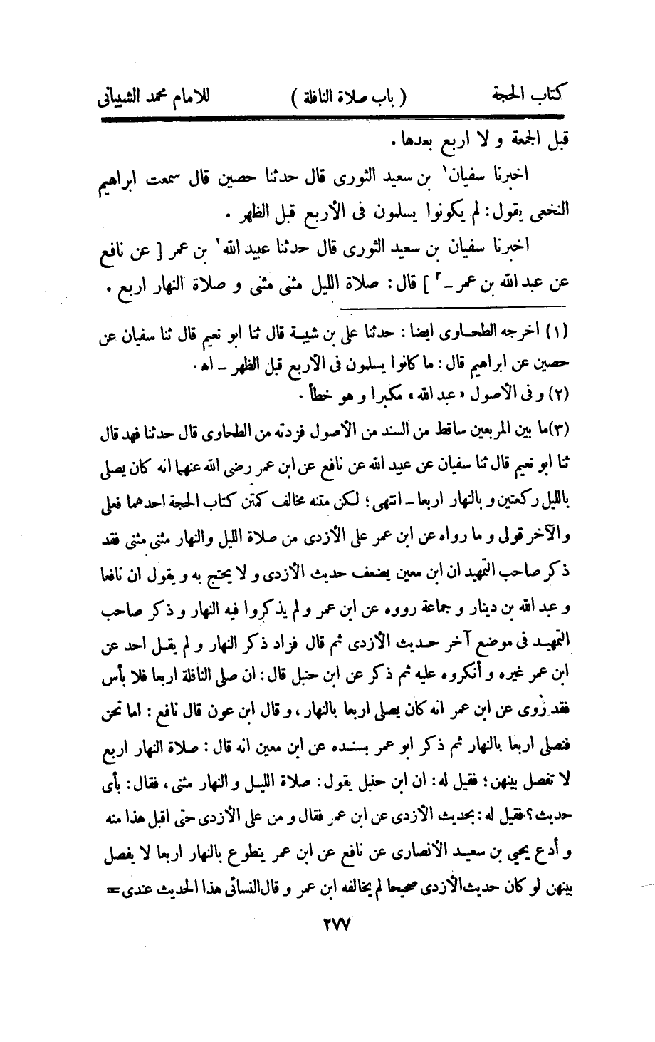اُخْبُرْنَا سُفْيَان بن سعيد الثَّوْريّ قَالَ حَدثنَا عبيد الله بن عمر عَن نَافِع عَن عبد الله بن عمر قَالَ صَلَاة اللَّيْل مثنى مثنى وَصَلَاة النَّهَار ارْبَعْ