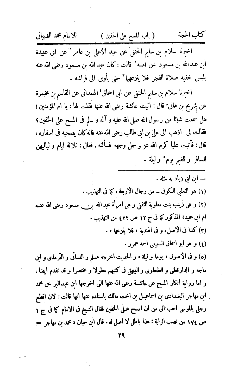 اُخْبُرْنَا سَلام بن سليم الْحَنَفِيّ عَن عبد الاعلى بن عَامر عَن ابي عُبَيْدَة ابْن عبد الله بن مَسْعُود عَن امهِ قَالَت كَانَ عبد الله بن مَسْعُود رَضِي الله عَنهُ يلبس خفيه صَلَاة الْفجْر فَلَا ينزعهما حَتَّى يأوى الى فرَاشه