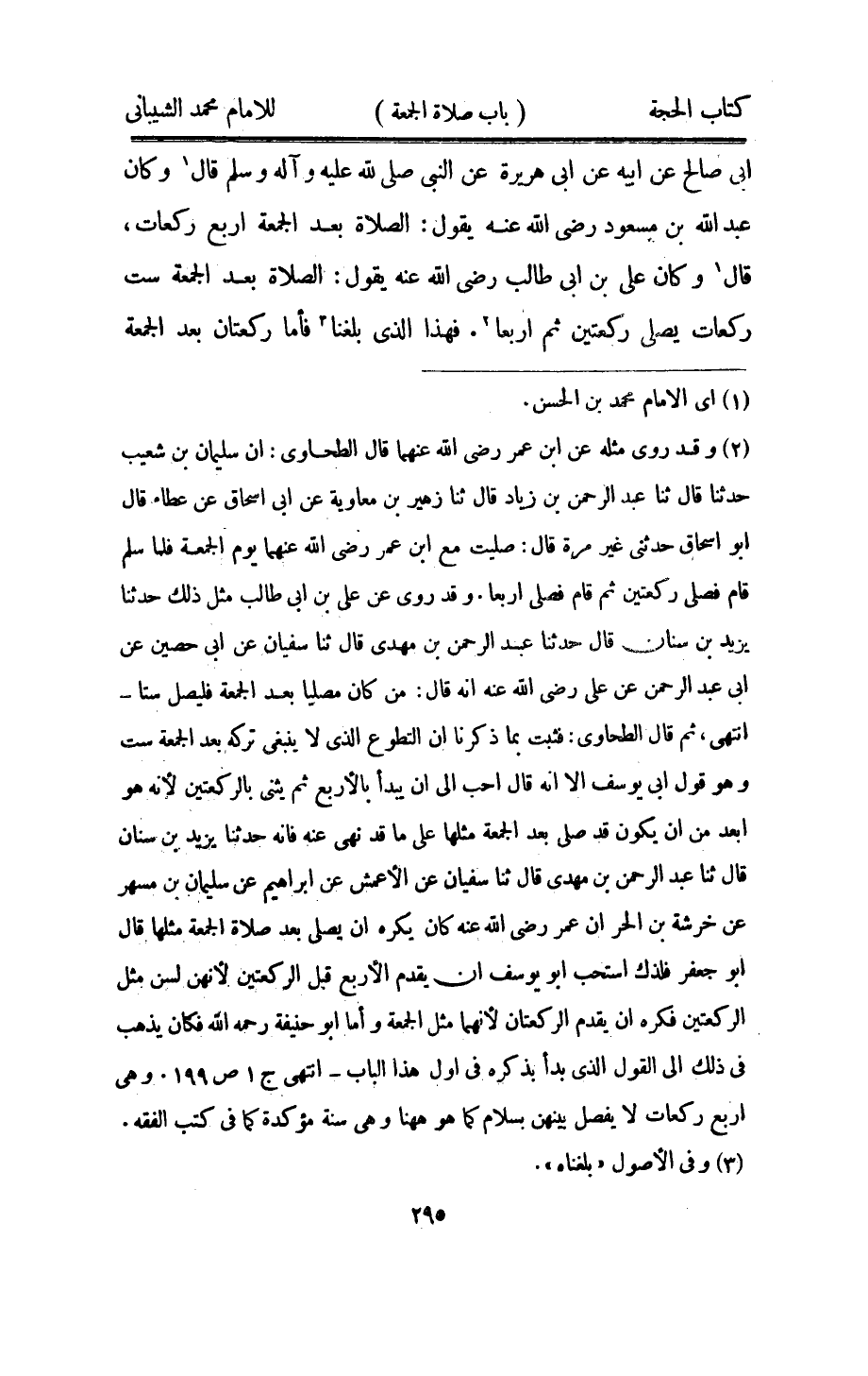 أبي صَالح عَن أَبِيه عَن أبي هُرَيْرَة عَن النَّبِي صلى الله عَلَيْهِ واله وَسلم قَالَ وَكَانَ عبد الله بن مَسْعُود رَضِي الله عَنهُ يَقُول الصَّلَاة بعد الْجُمُعَة أَربع رَكْعَات قَالَ وَكَانَ عَليّ بن أبي طَالب رَضِي الله عَنهُ يَقُول الصَّلَاة بعد الْجُمُعَة سِتّ رَكْعَات يُصَلِّي رَكْعَتَيْنِ ثمَّ أَرْبعا فَهَذَا الَّذِي بلغنَا فَأَما رَكْعَتَانِ بعد الْجُمُعَة