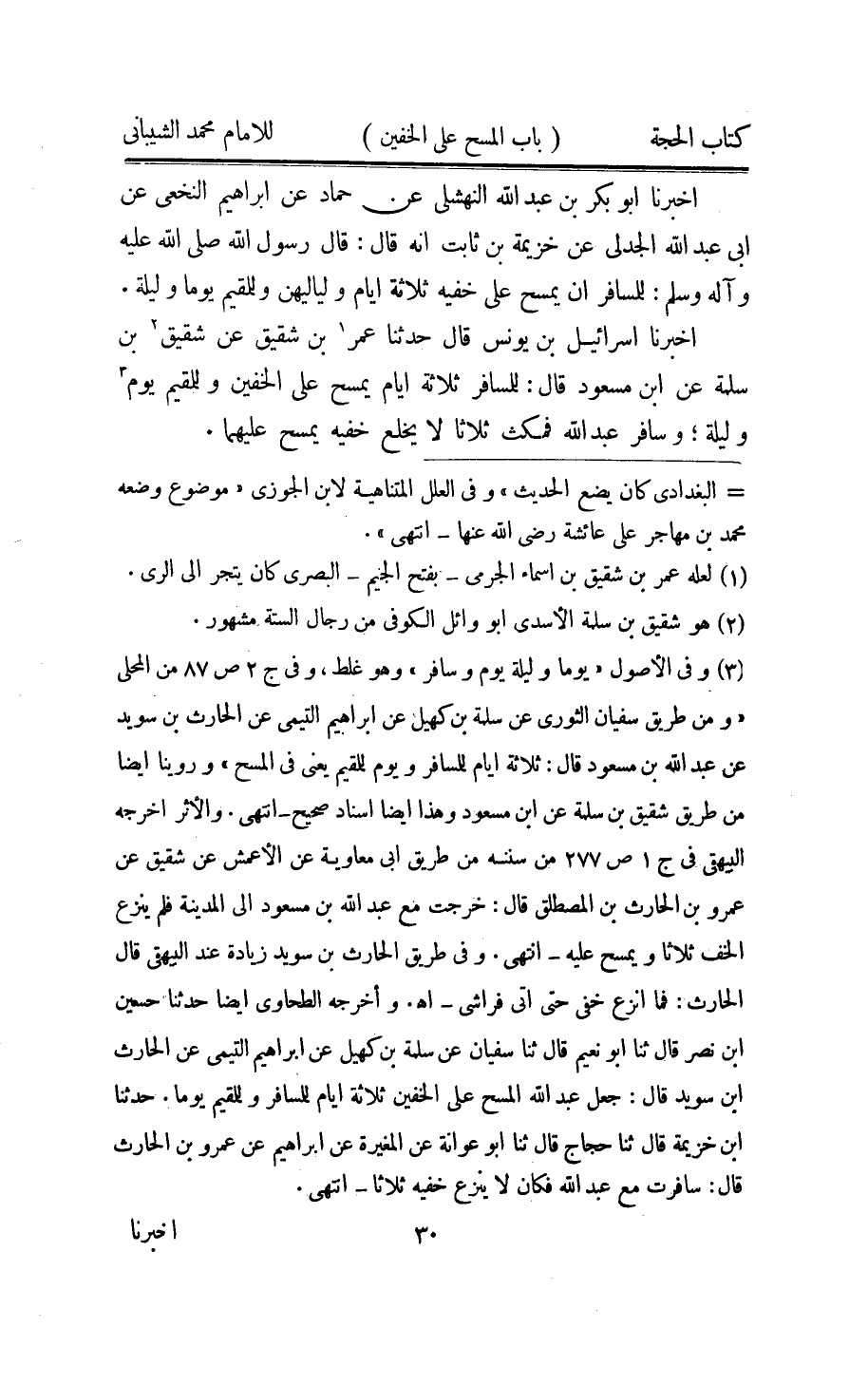 اُخْبُرْنَا ابو بكر بن عبد الله النَّهْشَلِي عَن حَمَّاد عَن ابراهيم النَّخعِيّ عَن ابي عبد الله الجدلي عَن خُزَيْمَة بن ثَابت انه قَالَ قَالَ رَسُول الله صلى الله عَلَيْهِ وَسلم للْمُسَافِر ان يمسح على خفيه ثَلَاثَة ايام ولياليهن وللمقيم يَوْمًا وَلَيْلَة