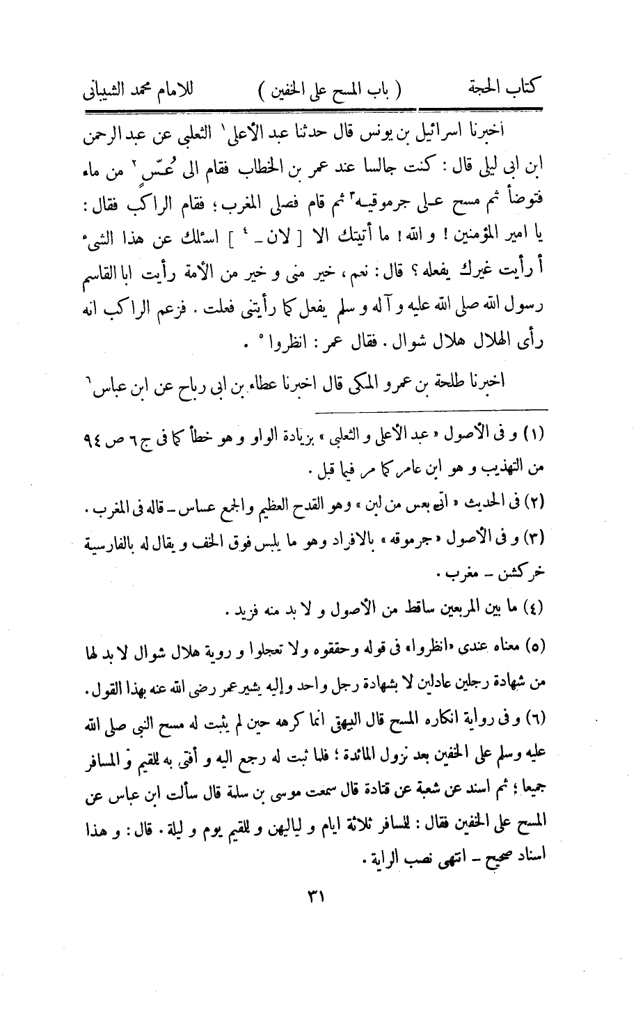 اُخْبُرْنَا اسرائيل بن يُونُس قَالَ حَدثنَا عبد الاعلى الثَّعْلَبِيّ عَن عبد الرَّحْمَن ابْن ابي ليلى قَالَ كنت جَالِسا عِنْد عمر بن الْخطاب فَقَامَ الى عس من مَاء فَتَوَضَّأ ثمَّ مسح على جرموقيه ثمَّ قَامَ فصلى الْمغرب فَقَامَ الرَّاكِب فَقَالَ يَا امير الْمُؤمنِينَ وَالله مَا أَتَيْتُك الا (لَان) اسئلك عَن هَذَا الشَّيْء أَرَأَيْت غَيْرك يَفْعَله قَالَ نعم خير منى وَخير من الامة رَأَيْت ابا الْقَاسِم رَسُول الله صلى الله عَلَيْهِ وَسلم يفعل كَمَا رَأَيْتنِي فعلت فَزعم الرَّاكِب انه رأى الْهلَال هِلَال شَوَّال فَقَالَ عمر انْظُرُوا