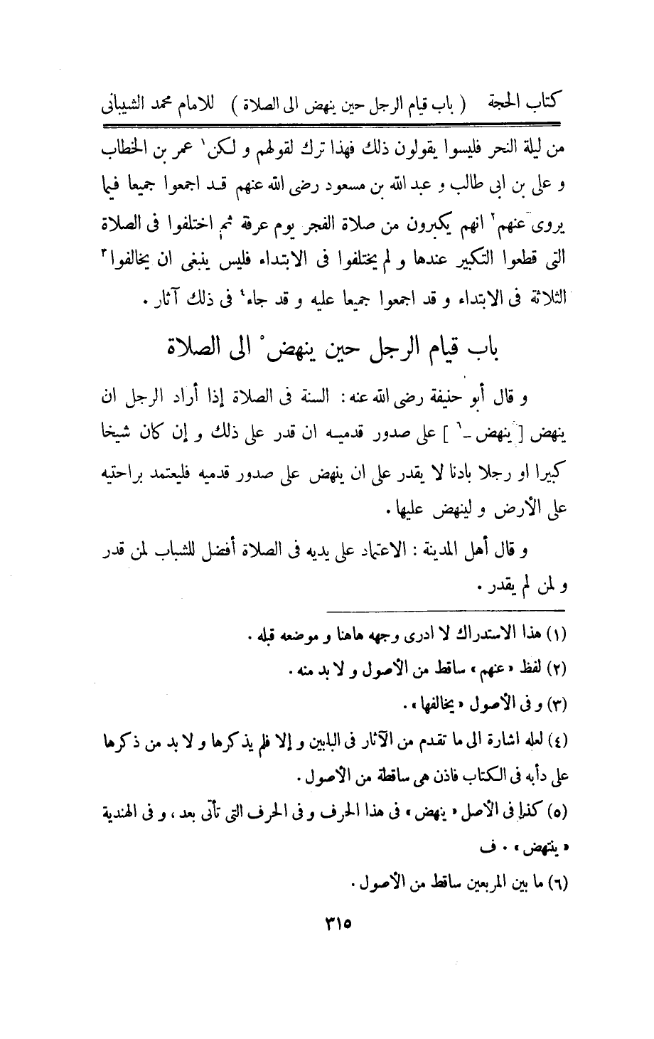 وَقَالَ أَبُو حنيفَة رَضِي الله عَنهُ السّنة فِي الصَّلَاة إِذا أَرَادَ الرجل أَن ينْهض ينعهض على صُدُور قَدَمَيْهِ أَن قدر على ذَلِك وَأَن كَانَ شَيخا كَبِيرا أَو رجلا بادنا لَا يقدر على أَن ينْهض على صُدُور قَدَمَيْهِ فليعتمد براحتيه على الأَرْض ولينهض عَلَيْهَا