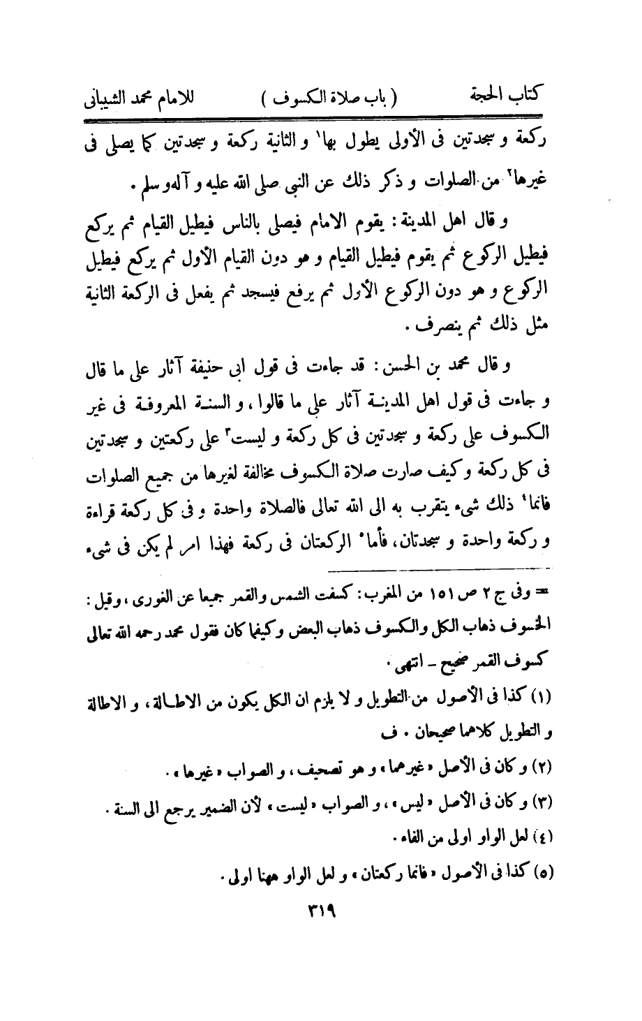 وَقَالَ مُحَمَّد بن الْحسن قد جَاءَت فِي قَول أبي حنيفَة أثار على مَا قَالَ وَجَاءَت فِي قَول أهل الْمَدِينَة أثار على مَا قَالُوا وَالسّنة الْمَعْرُوفَة فِي غير الْكُسُوف على رَكْعَة وسجدتين فِي كل رَكْعَة وَلَيْسَت على رَكْعَتَيْنِ وسجدتين فِي كل رَكْعَة وَكَيف صَارَت صَلَاة الْكُسُوف مُخَالفَة لغَيْرهَا من جَمِيع الصَّلَوَات فَإِنَّمَا ذَلِك شَيْء يتَقرَّب بِهِ إِلَى الله تَعَالَى فَالصَّلَاة وَاحِدَة وَفِي كل رَكْعَة قِرَاءَة وركعة وَاحِدَة وسجدتان فَأَما الركعتان فِي رَكْعَة فَهَذَا أَمر لم يكن فِي شَيْء