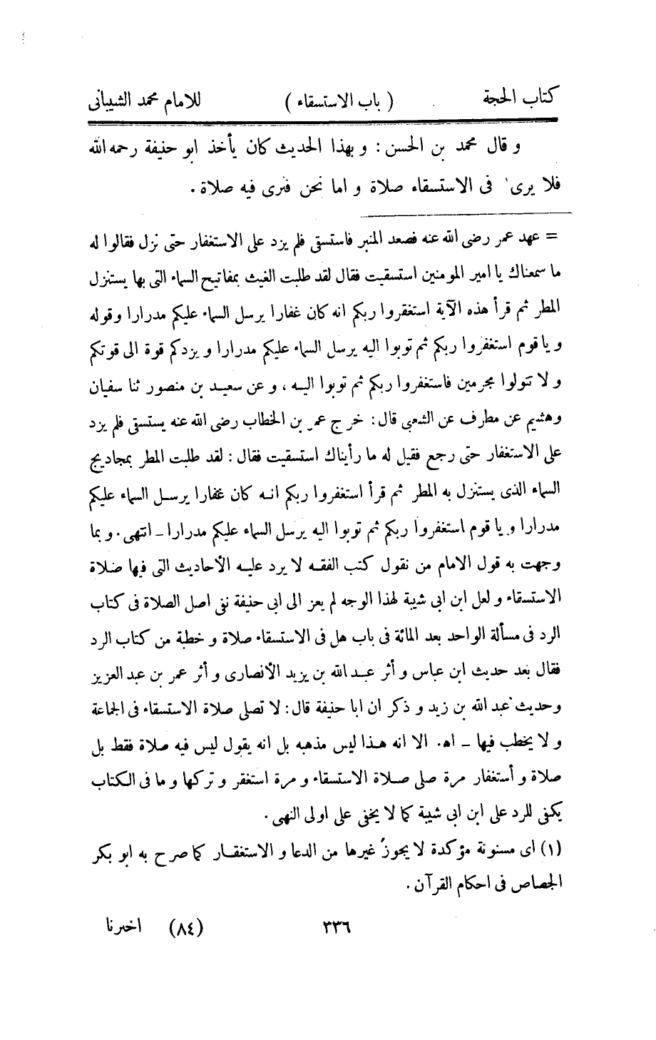 وَقَالَ مُحَمَّد بن الْحسن وَبِهَذَا الحَدِيث كَانَ يَأْخُذ ابو حنيفَة رَحمَه فَلَا يرى فِي الاسْتِسْقَاء صَلَاة واما نَحن فنرى فِيهِ صَلَاة