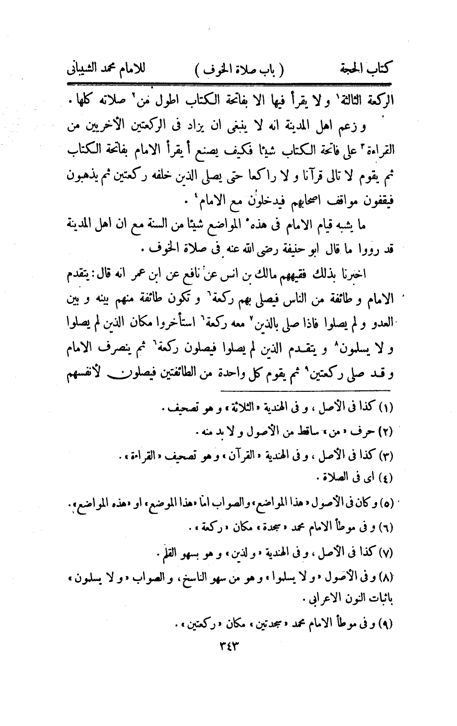 اُخْبُرْنَا بذلك فقيههم مَالك بن انس عَن نَافِع عَن ابْن عمر انه قَالَ يتَقَدَّم الامام وَطَائِفَة من النَّاس فَيصَلي بهم رَكْعَة وَتَكون طَائِفَة مِنْهُم بَينه وَبَين الْعَدو وَلم يصلوا فاذا صلى بالذين مَعَه رَكْعَة استأجروا مَكَان الَّذين لم يصلوا وَلَا يسلمُونَ ويتقدم الَّذين لم يصلوا فيصلون رَكْعَة ثمَّ ينْصَرف الامام وَقد صلى رَكْعَتَيْنِ ثمَّ يقوم كل وَاحِدَة من الطَّائِفَتَيْنِ فيصلون لانفسهم