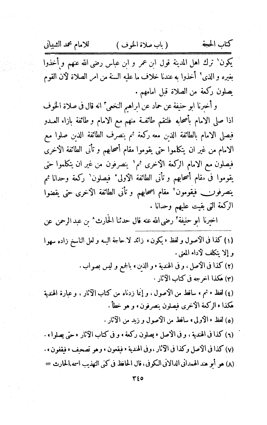 واخبرنا ابو حنيفَة عَن حَمَّاد عَن ابراهيم النَّخعِيّ انه قَالَ فِي صَلَاة الْخَوْف اذا صلى الامام بِأَصْحَابِهِ فلتقم طَائِفَة مِنْهُم مَعَ الامام وَطَائِفَة بازاء الْعَدو فَيصَلي الامام بالطائفة الَّذين مَعَه رَكْعَة ثمَّ ينْصَرف الطَّائِفَة الَّذين صلوا مَعَ الامام من غير ان يتكلموا حَتَّى يقومُوا مقَام اصحابهم وَتَأْتِي الطَّائِفَة الاخرى فيصلون مَعَ الامام الرَّكْعَة الاخرى ثمَّ يَنْصَرِفُونَ من غير ان يتكلموا حَتَّى يقومُوا فِي مقَام اصحابهم وَتَأْتِي الطَّائِفَة الاولى فيصلون رَكْعَة وحدانا ثمَّ يَنْصَرِفُونَ فَيقومُونَ مقَام اصحابهم وَتَأْتِي الطَّائِفَة الاخرى حَتَّى يقضوا الرَّكْعَة الَّتِي بقيت عَلَيْهِم وحدانا
