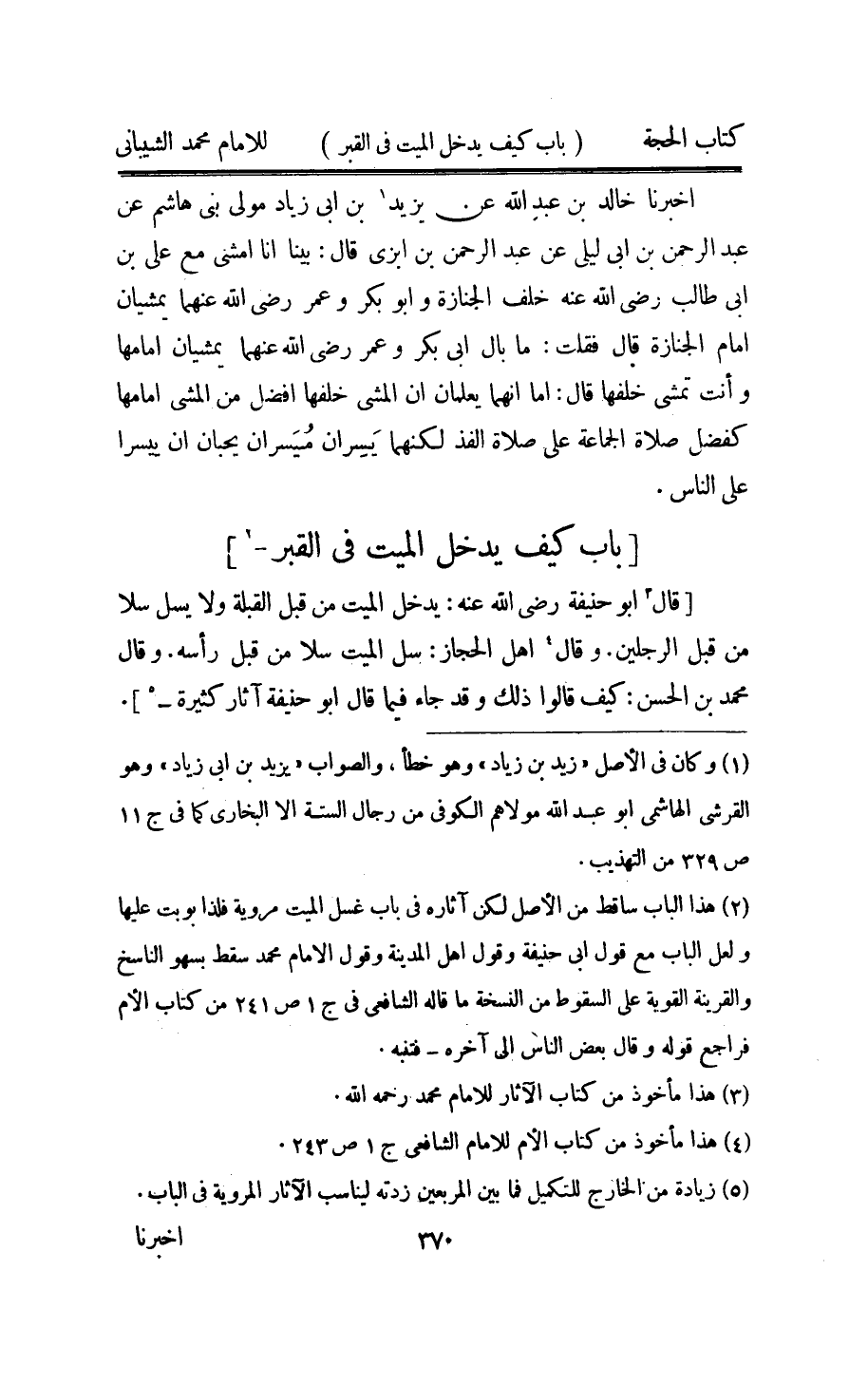 اُخْبُرْنَا خَالِد بن عبد الله عَن يزِيد بن ابي زِيَاد مولى بني هَاشم عَن عبد الرَّحْمَن بن ابي ليلى عَن عبد الرَّحْمَن بن ابزي قَالَ بَينا انا امشي مَعَ عَليّ بن ابي طَالب رَضِي الله عَنهُ خلف الْجِنَازَة وابو بكر وَعمر رَضِي الله عَنْهُمَا يمشيان امام الْجِنَازَة قَالَ فَقلت مَا بَال ابي بكر وَعمر رَضِي الله عَنْهُمَا يمشيان امامها وانت تمشي خلفهَا قَالَ اما انهما يعلمَانِ ان الْمَشْي خلفهَا افضل من الْمَشْي امامها كفضل صَلَاة الْجَمَاعَة على صَلَاة الْفَذ لكنهما يسران ميسران يُحِبَّانِ ان ييسرا على النَّاس