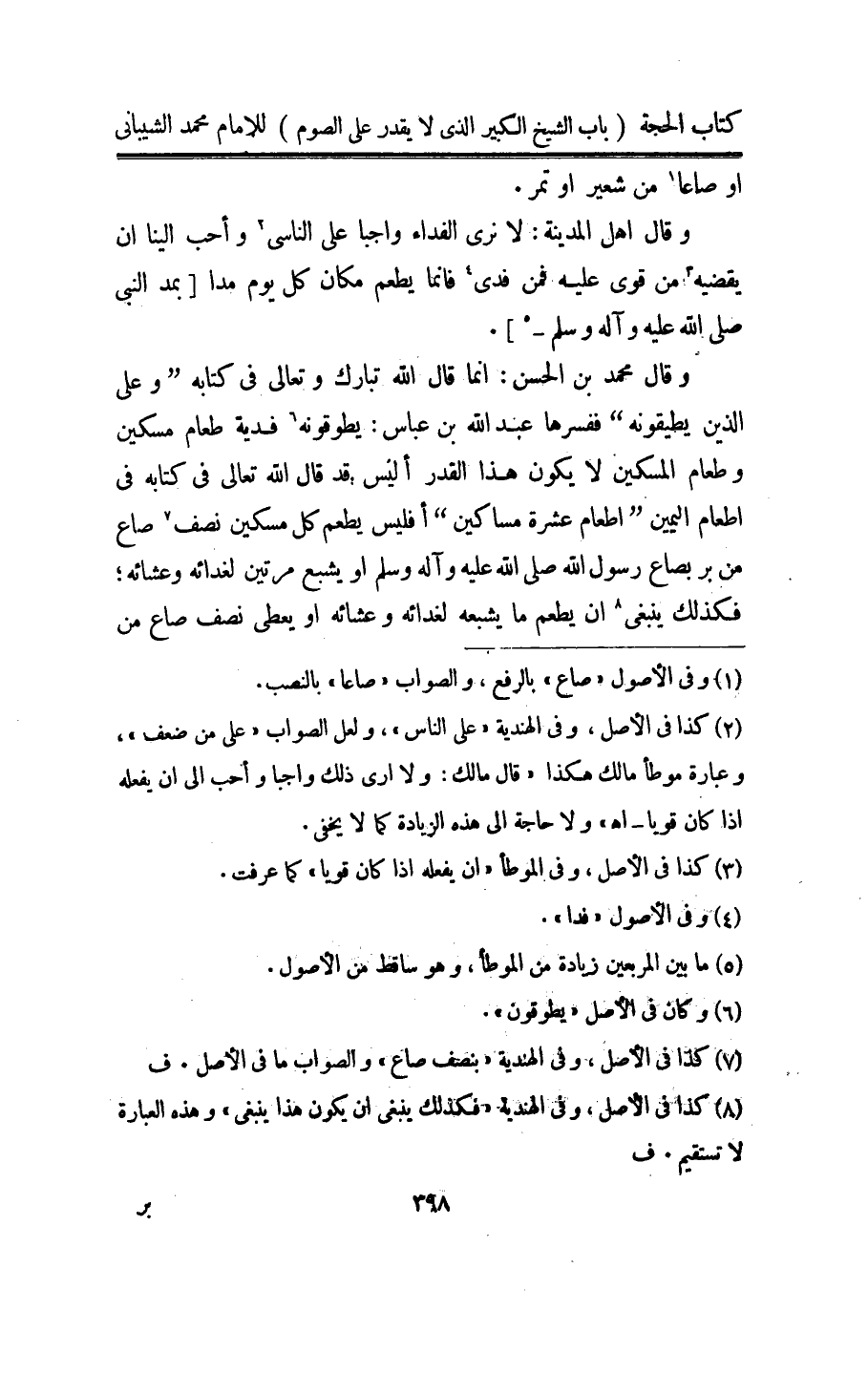 وَقَالَ مُحَمَّد بن الْحسن انما قَالَ الله تبَارك وَتَعَالَى فِي كِتَابه {وعَلى الَّذين يطيقُونَهُ} فَفَسَّرَهَا عبد الله بن عَبَّاس يطوقونه فديَة طَعَام مِسْكين وَطَعَام الْمِسْكِين لَا يكون هَذَا الْقدر أَلَيْسَ قد قَالَ الله تَعَالَى فِي كِتَابه فِي اطعام الْيَمين {إطْعَام عشرَة مَسَاكِين} أفليس يطعم كل مِسْكين نصف صَاع من بر بِصَاع رَسُول الله صلى الله عَلَيْهِ وَسلم اَوْ يشْبع مرَّتَيْنِ لغدائه وعشائه فَكَذَلِك يَنْبَغِي ان يطعم مَا يشبعه لغدائه وعشائه اَوْ يعْطى نصف صَاع من