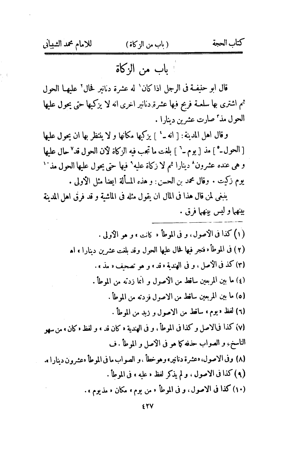 وَقَالَ اهل الْمَدِينَة انه يزكيها مَكَانهَا وَلَا ينْتَظر بهَا ان يحول عَلَيْهَا الْحول مذ يَوْم بلغت مَا تجب فِيهِ الزَّكَاة لَان الْحول قد حَال عَلَيْهَا وَهِي عِنْده عشرُون دِينَارا ثمَّ لَا زَكَاة عَلَيْهِ فِيهَا حَتَّى يحول عَلَيْهَا الْحول من يَوْم زكيت وَقَالَ مُحَمَّد بن الْحسن وَهَذِه الْمَسْأَلَة ايضا مثل الاولى