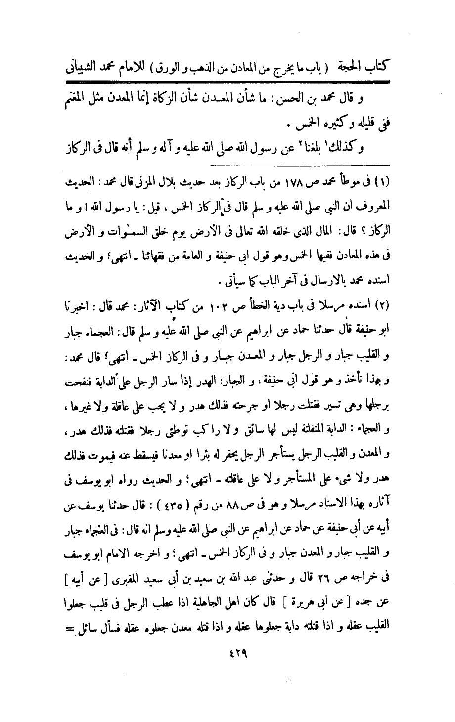 وَقَالَ مُحَمَّد بن الْحسن مَا شَأْن الْمَعْدن شَأْنه الزَّكَاة انما الْمَعْدن مثل الْمغنم فَفِي قَلِيله وكثيرة الْخمس