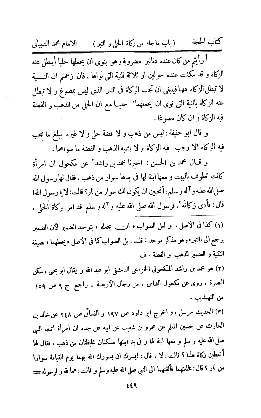 وَقَالَ مُحَمَّد بن الْحسن اُخْبُرْنَا مُحَمَّد بن رَاشد عَن مَكْحُول ان امْرَأَة كَانَت تَطوف بِالْبَيْتِ وَمَعَهَا ابْنة لَهَا فِي يَدهَا سوار من ذهب فَقَالَ لَهَا رَسُول الله صلى الله عَلَيْهِ وَسلم اتحبين ان يكون لَك سوار من نَار قَالَت لَا يَا رَسُول الله قَالَ فَأدى زَكَاته فَرَسُول الله صلى الله عَلَيْهِ وَسلم قد امْر بِزَكَاة الْحلِيّ