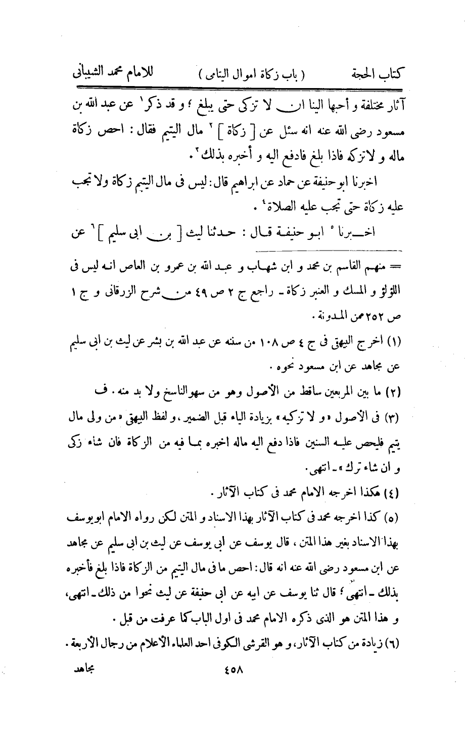 أثار مُخْتَلفَة وأحبها ألينا أَن لَا تزكّى حَتَّى يبلغ وَقد ذكر عَن عبد الله بن مَسْعُود رَضِي الله عَنهُ انه سُئِلَ عَن زَكَاة مَال الْيَتِيم فَقَالَ أحص زَكَاة مَاله وَلَا تزكه فَإِذا بلغ فادفع إِلَيْهِ وَأخْبرهُ بذلك