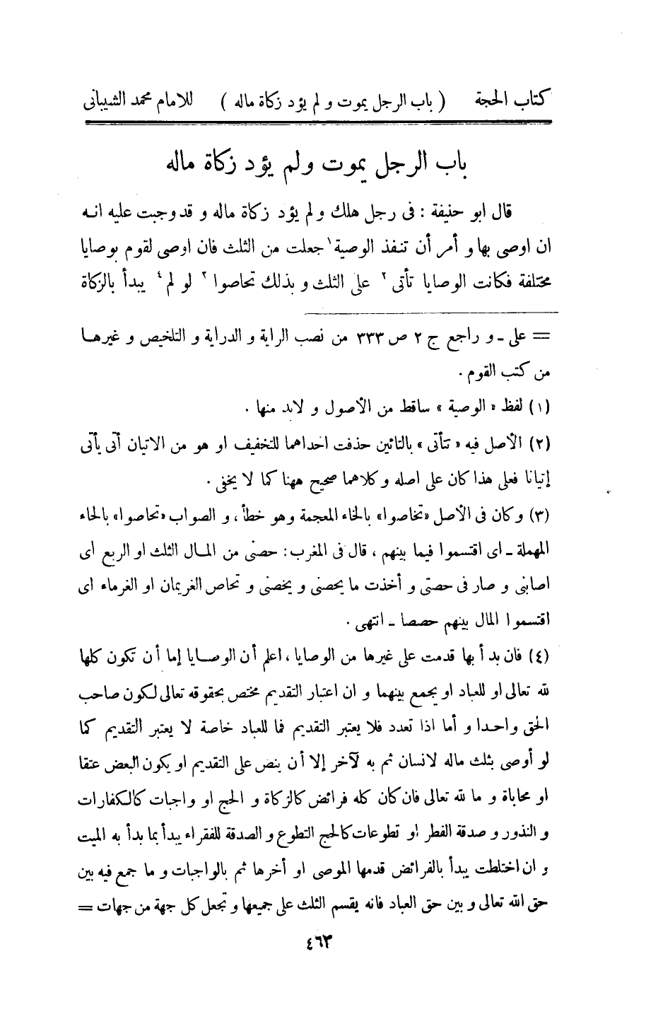 قَالَ أَبُو حنيفَة فِي رجل هلك وَلم يؤد زَكَاة مَاله وَقد وَجَبت عَلَيْهِ أَنه أَن اوصى بهَا وَأمر أَن تنفذ الْوَصِيَّة جعلت من الثُّلُث فَأن أوصى لقوم بوصايا مُخْتَلفَة فَكَانَت الْوَصَايَا تَأتي على الثُّلُث وَبِذَلِك تحاصوا لَو لم يبْدَأ بِالزَّكَاةِ