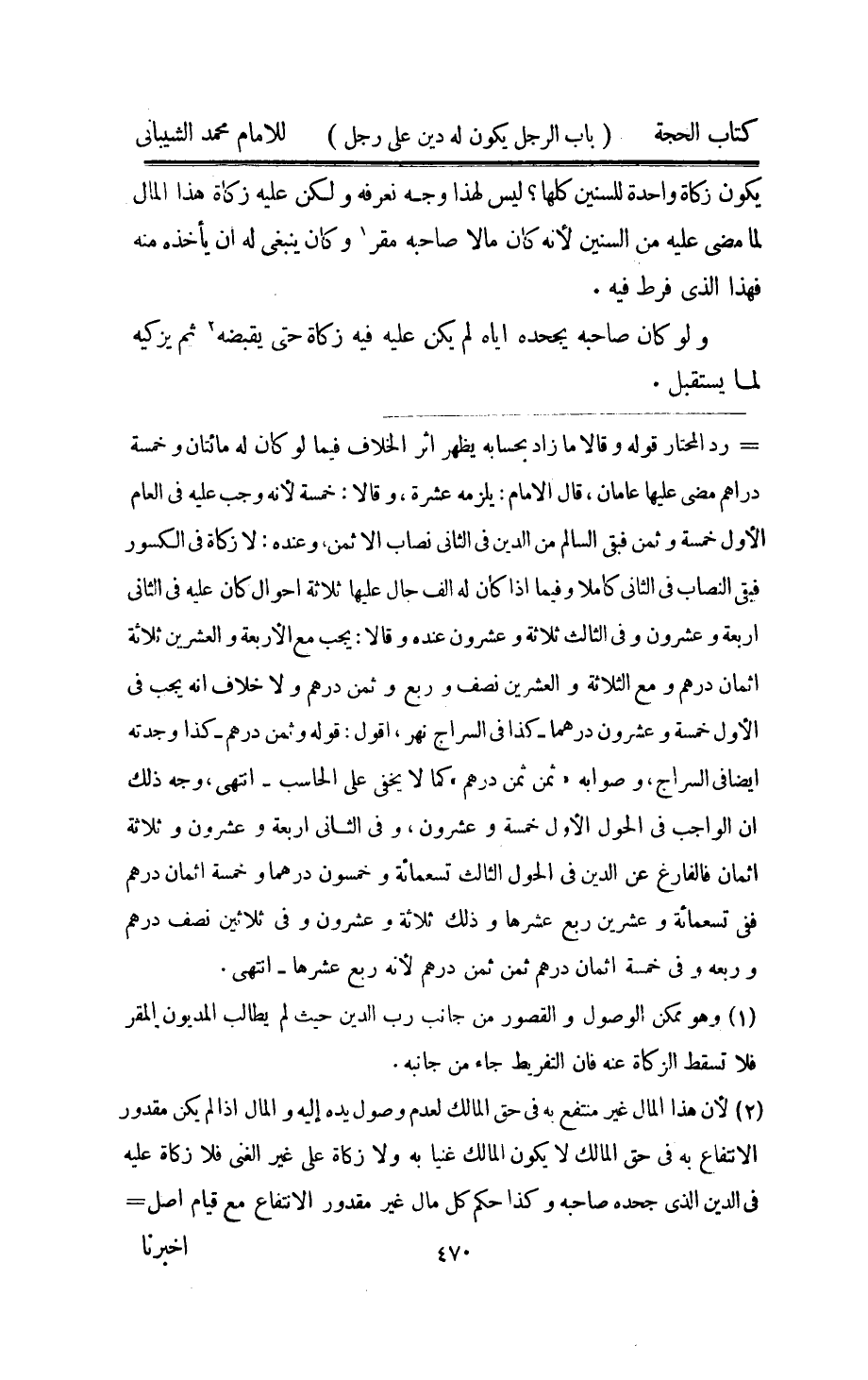 يكون زَكَاة وَاحِدَة للسنين كلهَا لَيْسَ لهَذَا وَجه نعرفه وَلَكِن عَلَيْهِ زَكَاة هَذَا المَال لما مضى عَلَيْهِ من السنين لِأَنَّهُ كَانَ مَالا صَاحبه مقرّ وَكَانَ يَنْبَغِي لَهُ ان يَأْخُذهُ مِنْهُ فَهَذَا الَّذِي فرط فِيهِ