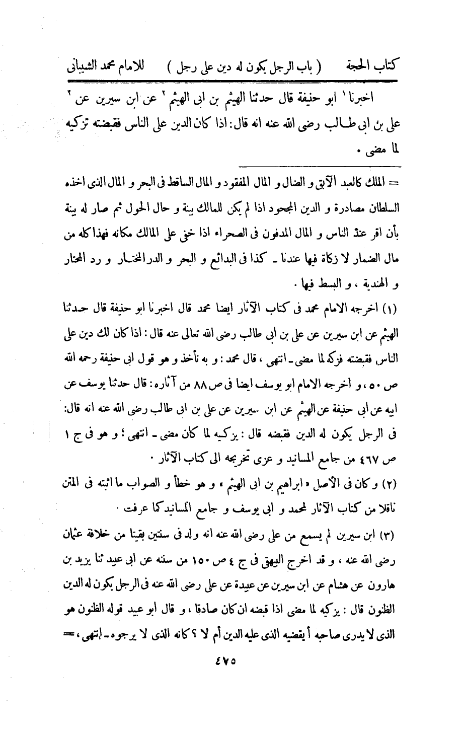 اُخْبُرْنَا ابو حنيفَة قَالَ حثدنا الْهَيْثَم بن ابي الْهَيْثَم عَن ابْن سِيرِين عَن عَليّ بن ابي طَالب رَضِي الله عَنهُ انه قَالَ اذا كَانَ الدّين على النَّاس فقبضته تزكيه لما مضى