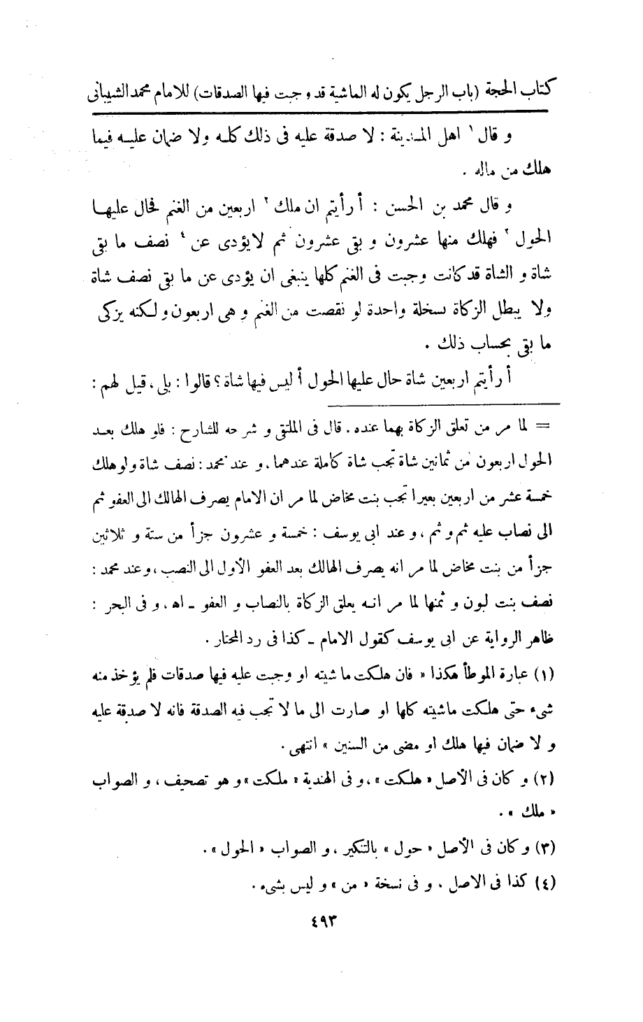 وَقَالَ مُحَمَّد بن الْحسن ارايتم ان ملك اربعين من الْغنم فحال عَلَيْهَا الْحول فَهَلَك مِنْهَا عشرُون وَبَقِي عشرُون ثمَّ لَا يُؤدى عَن نصف مَا بَقِي شَاة وَالشَّاة قد كَانَت وَجَبت فِي الْغنم كلهَا يَنْبَغِي ان يُؤدى عَن مَا بَقِي نصف شَاة وَلَا يبطل الزَّكَاة بسخلة وَاحِدَة لَو نقصت من الْغنم وَهِي اربعون وَلكنه يُزكي مَا بَقِي بِحِسَاب ذَلِك