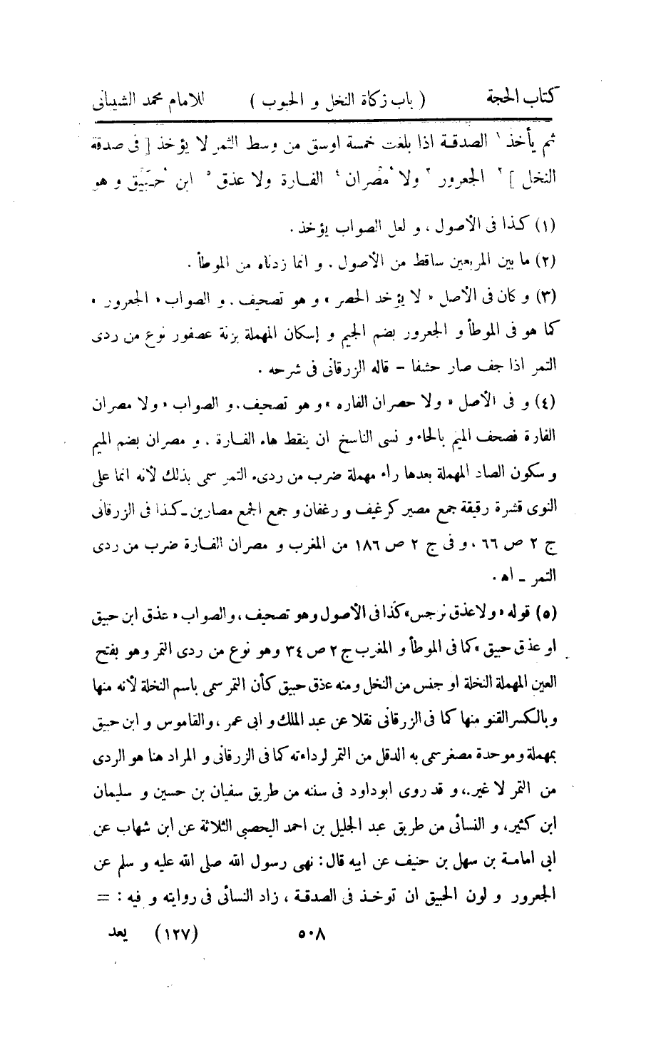 ثمَّ يَأْخُذ الصَّدَقَة اذا بلغت خَمْسَة اوسق من وسط الثَّمر لَا يُؤْخَذ فِي صَدَقَة النّخل الجعرور وَلَا مصران الفارة وَلَا عذق ابْن حبيق وَهُوَ