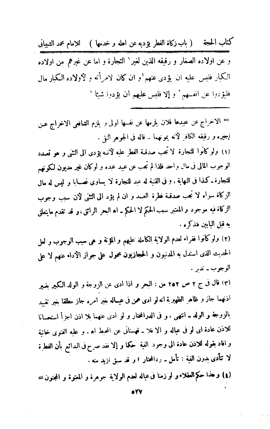 وَعَن اولاده الصغار ورقيقة الَّذين لغير التِّجَارَة واما عَن غَيرهم من اولاده الْكِبَار فَلَيْسَ عَلَيْهِ ان يُؤَدِّي عَنْهُم وان كَانَ لامْرَأَته ولاولاده الْكِبَار مَال فليؤدوا عَن انفسهم والا فَلَيْسَ عَلَيْهِم ان يؤدوا شَيْئا