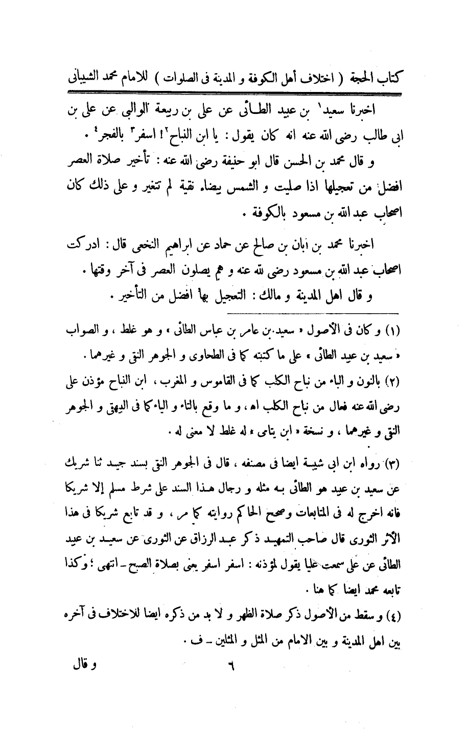 اُخْبُرْنَا سعيد بن عبيد الطَّائِي عَن عَليّ بن ربيعَة الْوَالِي عَن عَليّ بن ابي طَالب رَضِي الله عَنهُ انه كَانَ يَقُول يَا ابْن النباح اسفر بِالْفَجْرِ وَقَالَ مُحَمَّد بن الْحسن قَالَ ابو حنيفَة رَضِي الله عَنهُ تَأْخِير صَلَاة الْعَصْر افضل من تَعْجِيلهَا اذا صليت وَالشَّمْس بَيْضَاء نقية لم تَتَغَيَّر وعَلى ذَلِك كَانَ اصحاب عبد الله بن مَسْعُود بِالْكُوفَةِ
