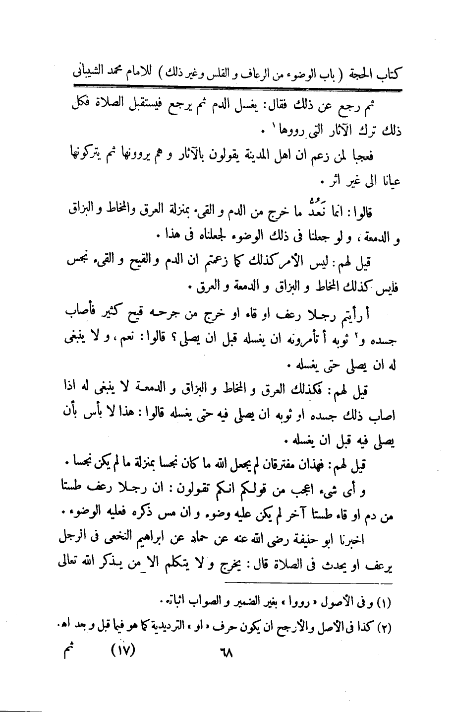 أَرَأَيْتُم رجلا رعف اَوْ قاء اَوْ خرج من جرحه قيح كثير فَأصَاب جسده وثوبه أتأمرونه ان يغسلهُ قبل ان يُصَلِّي قَالُوا نعم وَلَا يَنْبَغِي لَهُ ان يُصَلِّي حَتَّى يغسلهُ