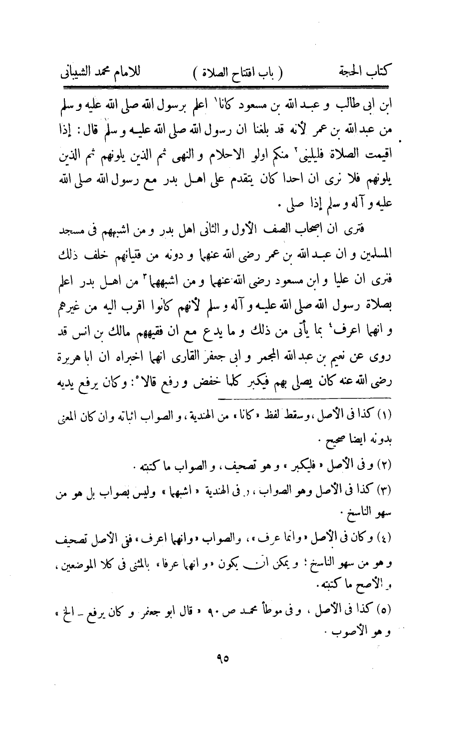ابْن ابي طَالب وَعبد الله بن مَسْعُود كَانَا اعْلَم برَسُول الله صلى الله عَلَيْهِ واله وَسلم من عبد الله عمر لِأَنَّهُ قد بلغنَا أَن رَسُول الله وَسلم صلى الله عَلَيْهِ وَسلم قَالَ اذا اقيمت الصَّلَاة فليليني مِنْكُم اولو الاحلام والنهى ثمَّ الَّذين يَلُونَهُمْ ثمَّ الَّذين يَلُونَهُمْ فَلَا نرى ان احدا كَانَ يتَقَدَّم على اهل بدر مَعَ رَسُول الله صلى الله عَلَيْهِ واله وَسلم اذا صلى فترى ان اصحاب الصَّفّ الاول وَالثَّانِي اهل بدر وَمن اشبههم فِي مَسْجِد الْمُسلمين وان عبد الله بن عمر رَضِي الله عَنْهُمَا ودونه من فتيانهم خلف ذَلِك فنرى عليا وَابْن مَسْعُود رَضِي الله عَنْهُمَا وَمن اشبههما من اهل بدر اعْلَم بِصَلَاة رَسُول الله صلى الله عَلَيْهِ واله وَسلم لانهم كَانُوا اقْربْ اليه من غَيرهم وانهما اعرف بِمَا ياتي من ذَلِك وَمَا يدع مَعَ ان فقيههم مَالك بن انس قد زوى عَن نعيم بن عبد الله المجمر وابي جَعْفَر الْقَارِي انهما اخبراه ان ابا هُرَيْرَة رَضِي الله عَنهُ كَانَ يُصَلِّي بهم فيكبر كلما خفض وَرفع قَالَا وَكَانَ يرفع يَدَيْهِ
