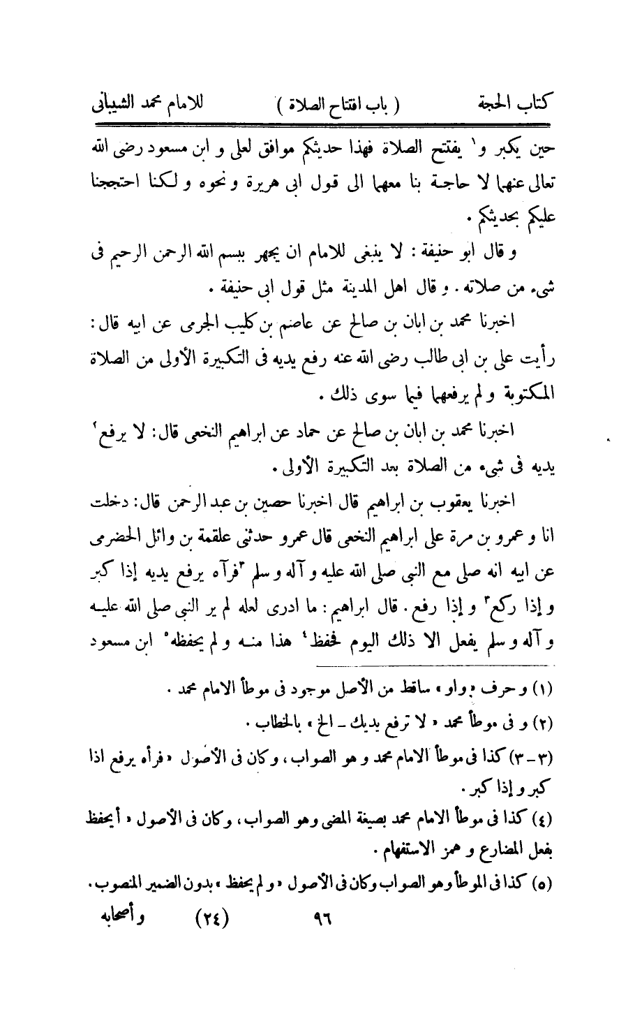اُخْبُرْنَا مُحَمَّد بن ابان بن صَالح عَن عَاصِم بن كُلَيْب الْجرْمِي عَن ابيه قَالَ رايت عَليّ بن ابي طَالب رَضِي الله عَنهُ رفع يَدَيْهِ فِي التَّكْبِيرَة الاولى من الصَّلَاة الْمَكْتُوبَة وَلم يرفعهما فِيمَا سوى ذَلِك