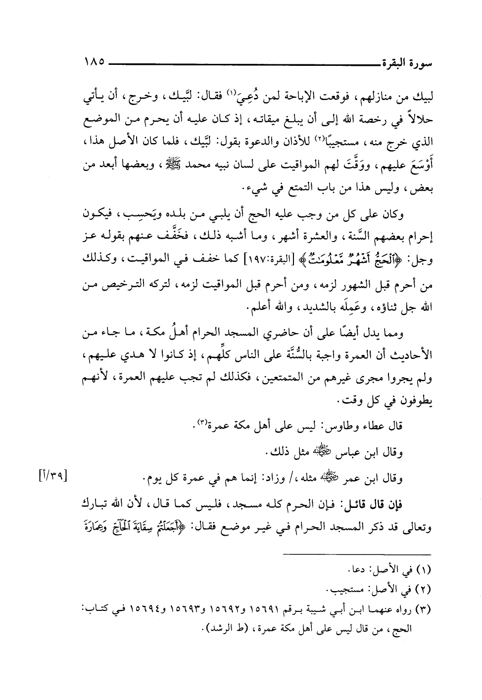 (¬٣) رواه عنهما ابن أبي شيبة برقم ١٥٦٩١ و ١٥٦٩٢ و ١٥٦٩٣ و ١٥٦٩٤ في كتاب: الحج، من قال ليس على أهل مكة عمرة، (ط الرشد).