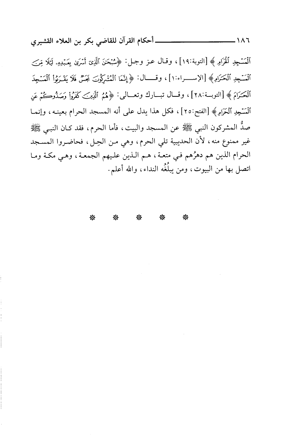 الْمَسْجِدِ الْحَرَامِ} [التوبة: ١٩]، وقال عز وجل: {سُبْحَانَ الَّذِي أَسْرَى بِعَبْدِهِ لَيْلًا مِنَ الْمَسْجِدِ الْحَرَامِ} [الإسراء: ١]، وقال: {إِنَّمَا الْمُشْرِكُونَ نَجَسٌ فَلَا يَقْرَبُوا الْمَسْجِدَ الْحَرَامَ} [التوبة: ٢٨]، وقال تبارك وتعالى: {هُمُ الَّذِينَ كَفَرُوا وَصَدُّوكُمْ عَنِ الْمَسْجِدِ الْحَرَامِ} [الفتح: ٢٥]، فكل هذا يدل على أنه المسجد الحرام بعينه، وإنما صدُّ المشركون النبي -صلى اللَّه عليه وسلم- عن المسجد والبيت، فأما الحرم، فقد كان النبي -صلى اللَّه عليه وسلم- غير ممنوع منه، لأن الحديبية تلي الحرم، وهي من الحِل، فحاضروا المسجد الحرام الذين هم دهرُهم في متعة، هم الذين عليهم الجمعة، وهي مكة وما اتصل بها من البيوت، ومن يبلُغُه النداء، واللَّه أعلم.